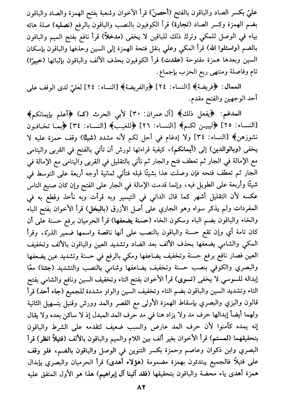 99 - أَنْبِياءَ* قرأ نافع بالهمز قبل الألف، والباقون بالياء بدلا من الهمزة، ولا إدغام فيه إذ ليس قبله ياء ساكنة، وهذا بخلاف المفرد وهو النبي منكرا ومعروفا وجمع السلامة نحو النبيين فلا بد من الإدغام بعد الإبدال كما تقدم وهم على أصولهم في المد.