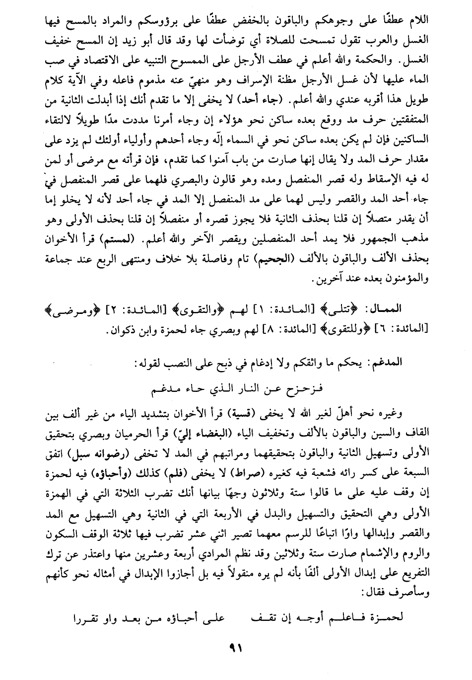 129 - طَهِّرا ورش فيه على أصله من ترقيق الراء لأجل الكسر وبعض أهل الأداء يفخمه من أجل ألف التثنية وبه قرأ الداني على أبي الحسن ابن غلبون، والمأخوذ به عند من قرأ بما في التيسير ونظمه الأول ومثله ساحران وتنتصران.