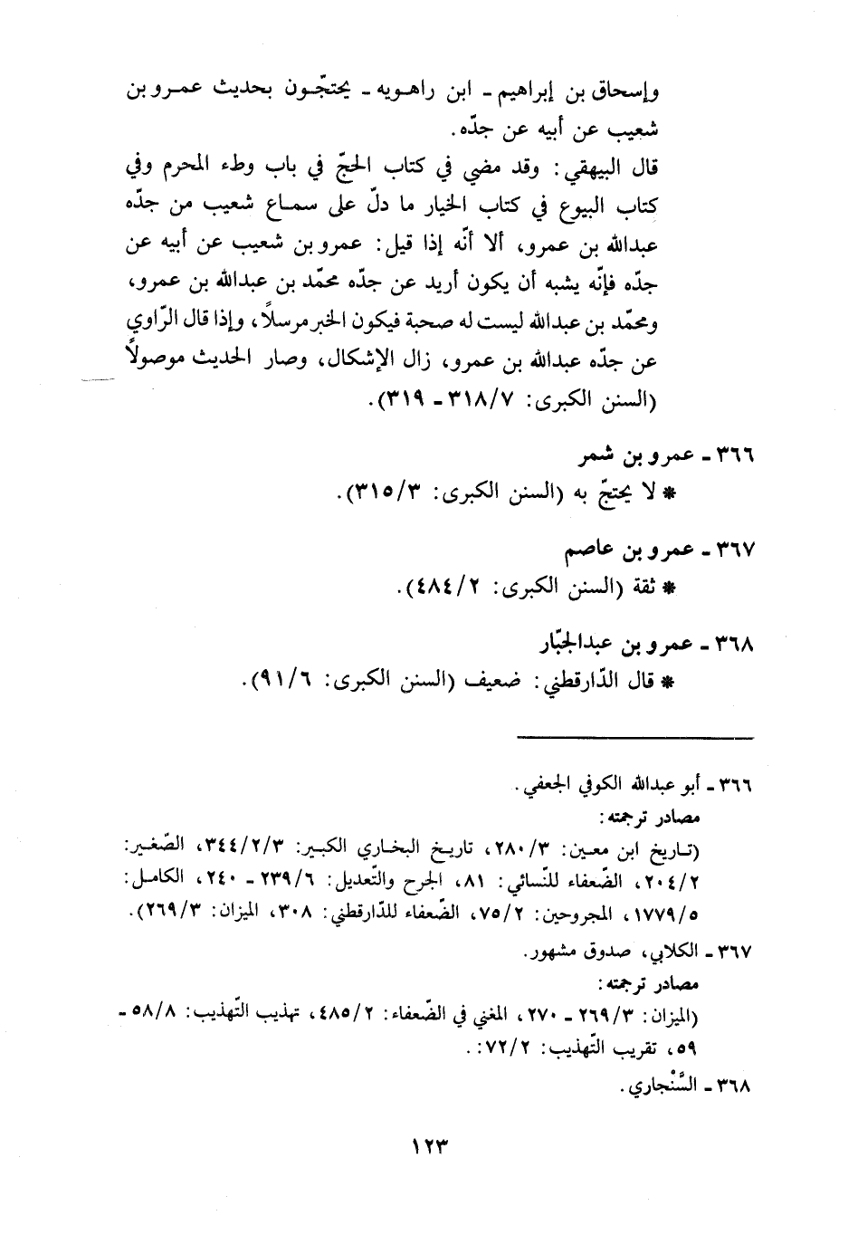 قال البيهقي: وقد مضي في كتاب الحج في باب وطء المحرم وفي كتاب البيوع في كتاب الخيار ما دل على سماع شعيب من جدّه عبد الله بن عمرو، ألا أنّه إذا قيل: عمرو بن شعيب عن أبيه عن جده فإنّه يشبه أن يكون أريد عن جدّه محمّد بن عبد الله بن عمرو، ومحمّد بن عبد الله ليست له صحبة فيكون الخبر مرسلًا، وإذا قال الراوي عن جده عبد الله بن عمرو، زال الإشكال، وصار الحديث موصولًا (السنن الكبرى: 7/ 318 - 319).