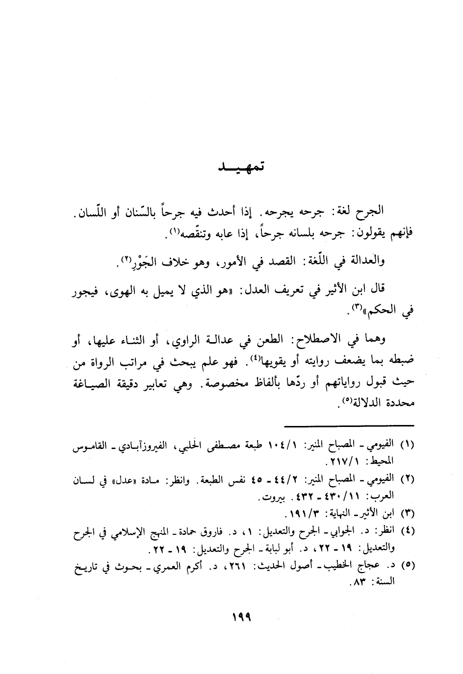 (¬4) انظر: د. الجوابب - الجرح والتّعديل: 1، د. فاروق حمادة- المنهج الإِسلامي في الجرح والتّعديل: 19 - 22، د. أبو لبابة- الجرح والتّعديل: 19 - 22.