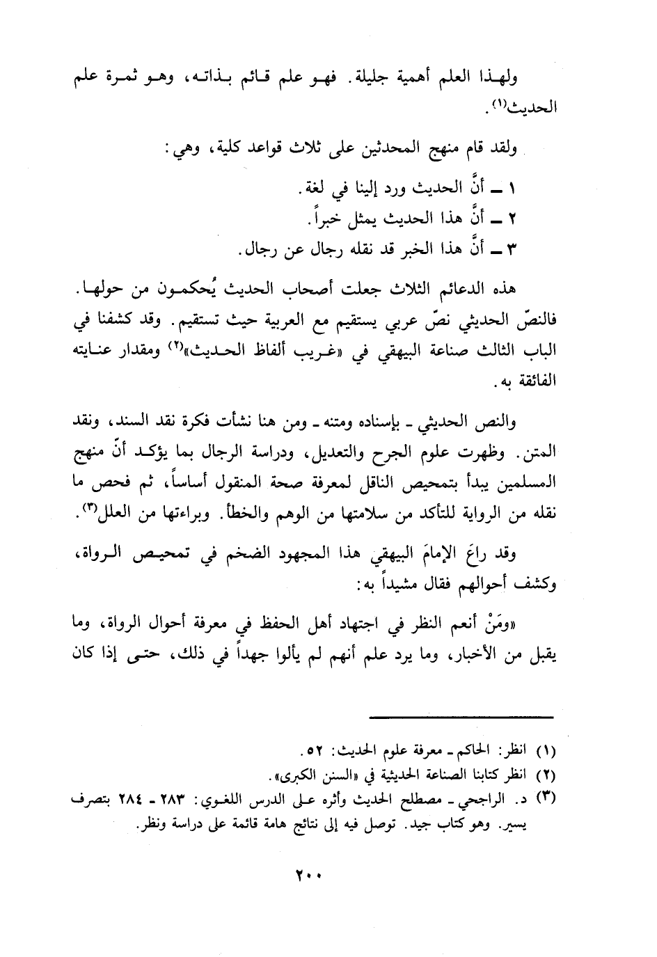والنص الحديثي -بإسناده ومتنه- ومن هنا نشأت فكرة نقد السند، ونقد المتن. وظهرت علوم الجرح والتّعديل، ودراسة الرجال بما يؤكد أنّ منهج المسلمين يبدأ بتمحيص الناقل لمعرفة صحة المنقول أساسًا، ثم فحص ما نقله من الرواية للتأكد من سلامتها من الوهم والخطأ. وبراعتها من العلل (¬3).