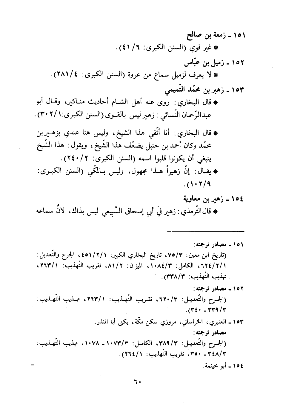 * قال البخاري: روى عنه أهل الشام أحاديث مناكير، وقال أبو عبد الرّحمان النّسائي: زهير ليس بالقوى (السنن الكبرى: 1/ 302).
