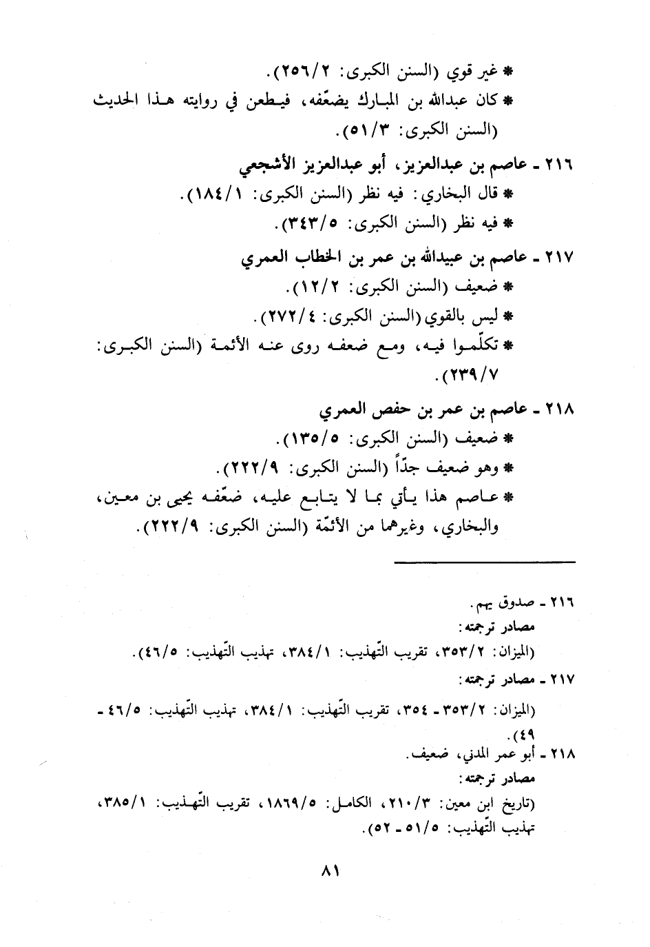 * عاصم هذا يأتي بما لا يتابع عليه، ضعّفه يحيى بن معين، والبخاري، وغيرهما من الأئمة (السنن الكبرى: 9/ 222).
