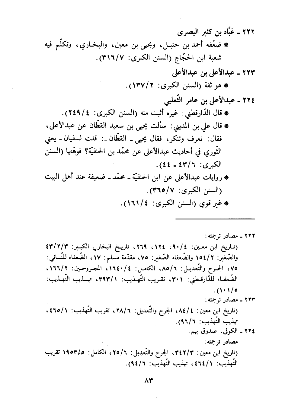 * قال علي بن المديني: سألت يحيى بن سعيد القطان عن عبد الأعلى، فقال: تعرف وتنكر، فقال يحيى -القطان-: قلت لسفيان- يعني الثوري في أحاديث عبد الأعلى عن محمّد بن الحنفيّة؟ فوهّنها (السنن الكبرى: 6/ 43 - 44).