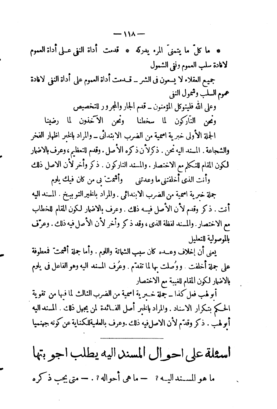التنبيه الثاني - (استغراق المفرد أشمل) من استغراق المثنى، والجمع، واسم الجمع لأن المفرد: يتناول كل واحد واحد من الأفراد، والمثنى إنما يتناول كل اثنين اثنين، والجمع إنما يتناول كل جماعة جماعة - بدليل صحة (لا رجال في الدار) إذا كان فيها رجل أو رجلان - بخلاف قولك (لا رجل) : فانه لا يصح إذا كان فيها رجل أو رجلان وهذه القضية ليست بصحيحة على عمومها، وانما تصح في النكرة المنفية، دون الجمع المعروف باللام - لأن المعروف بلام الاستغراق يتناول كل واحد من الأفراد نحو «الرجال قوامون على النساء» بل هو في المفرد أقوى، كما دل عليه الاستقراء وصرح به (أئمة اللغة وعلماء التفسير) في كل ما وقع في القرآن العزيز - نحو (أعلم غيب السموات والأرض) - (والله يحب المحسنين) - (وعلم آدم الأسماء كلها) - إلى غير ذلك من آي الذكر الحكيم - كما في المطولات.