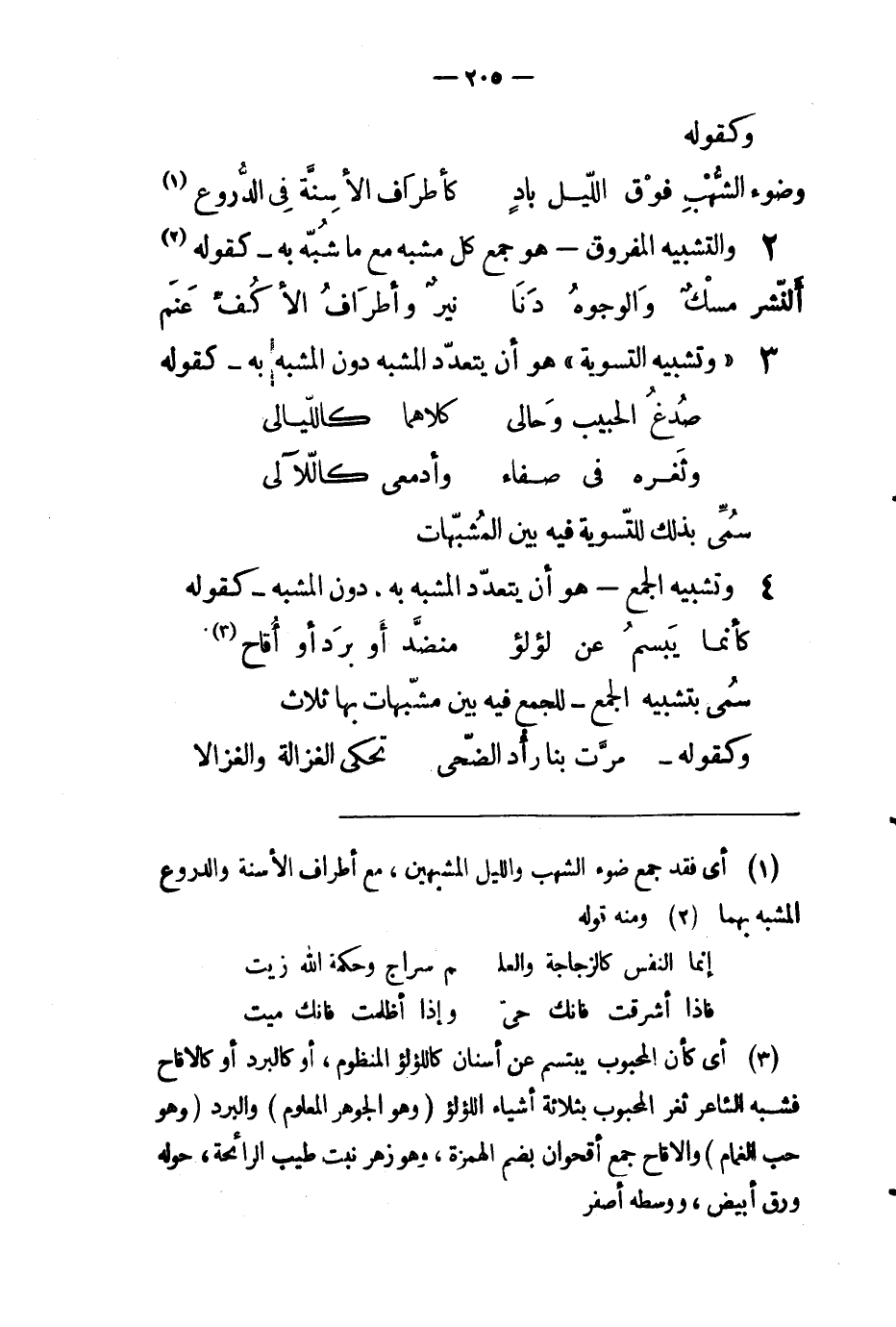 (10) ومنها التَّتميم - وهو زيادةُ فضلة، كمفعول - أو حال أو تمييز - أو جار ومجرور، توجد في المعنى حُسنا بحيث لو حذفت صار الكلام مبتذلا كقول ابن المعتز يصف فرساً