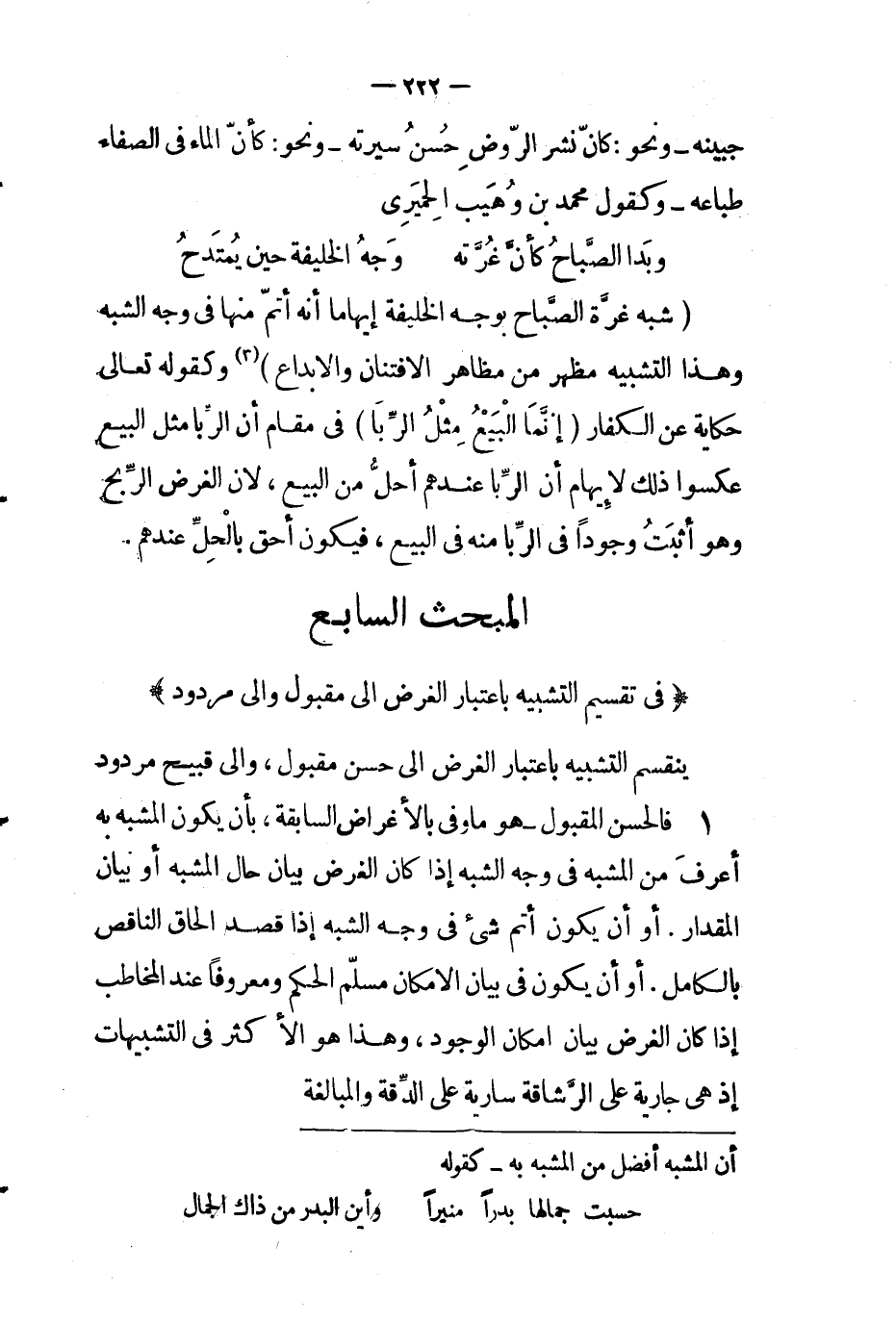 (4) وإما المشبه عقلي، والمشبه به حِسي - نحو - العلم كالنّور، واعلم أن العقلي هو ما عدا الحسي، فيشمل المحقق ذهناً: كالرأي والخلق، والحظ، والأمل والعلم. والعلم، والذكاء والشجاعة، ويشمل أيضاً الوهمي، وهو ما لا وجود له، ولا لأجزائه كلها، أو بعضها في الخارج، ولو وجد لكان مدركا باحدى الحواس.