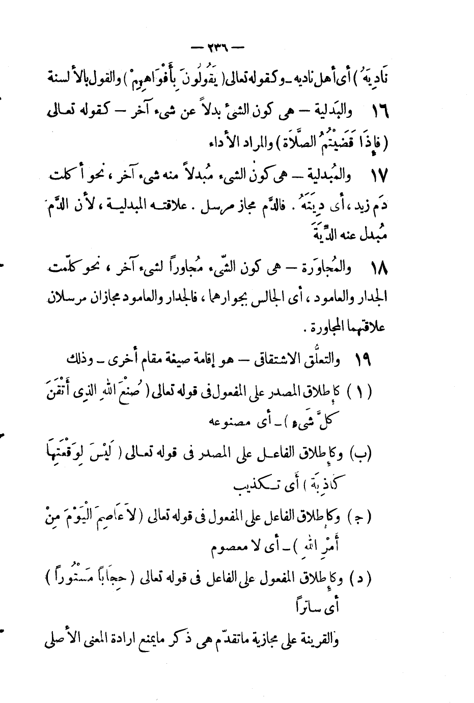 (¬3) (التشبيه) يفيد التفاوت، وأما (التشابه) فيفيد التساوي بلفظ تشابه، وتماثل وتشاكل، وتساوى، وتضارع، وكذا بقولك: كلاهما سواء - لا بما كان له فاعل ومفعول به: مثل شابه، وساوى، فان في هذا الحاق الناقص بالزائد.