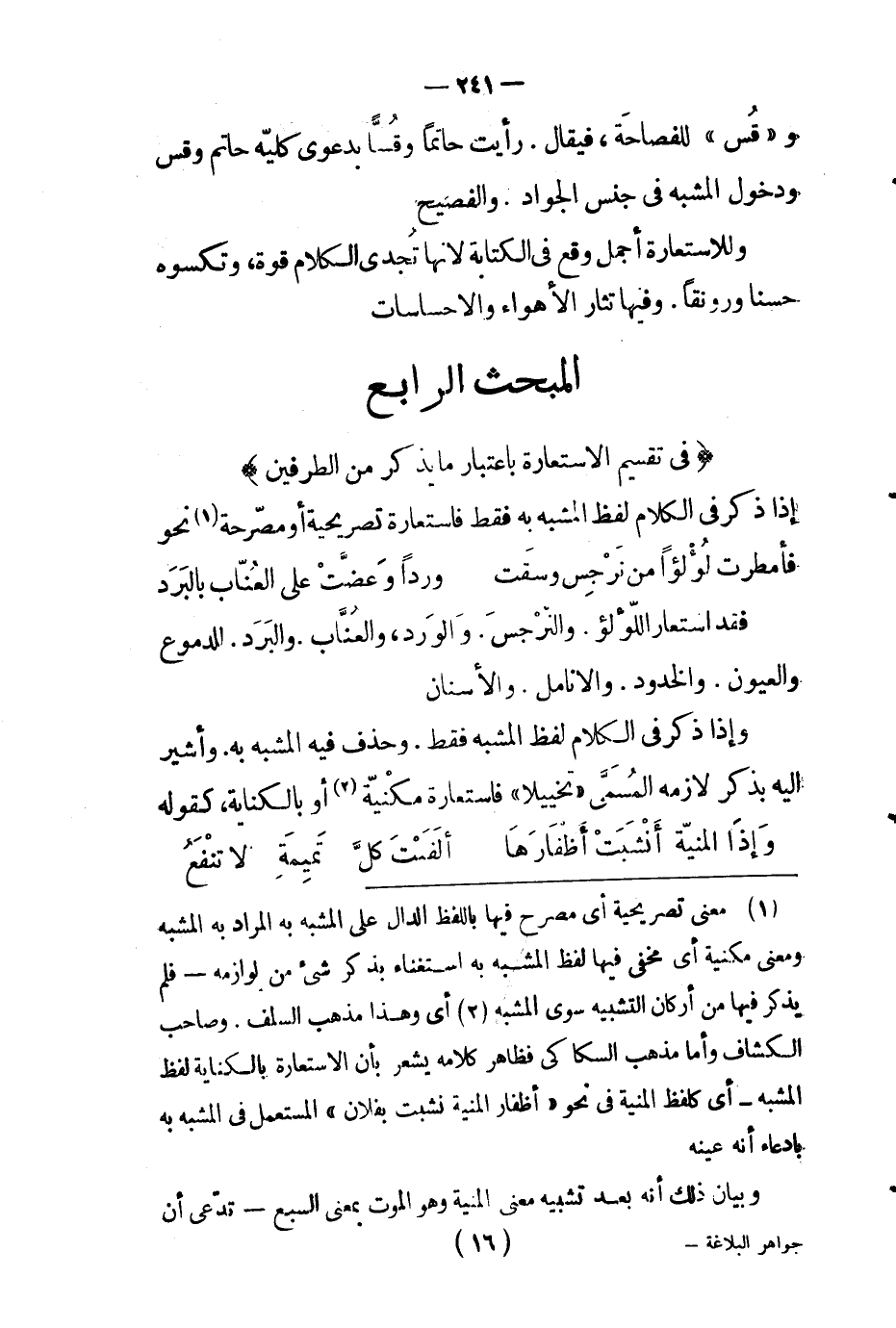 (الأول) بعض اساليب التشبيه أقوى من بعض في المبالغة، ووضوح الدلالة ولها مراتب ثلاثة: