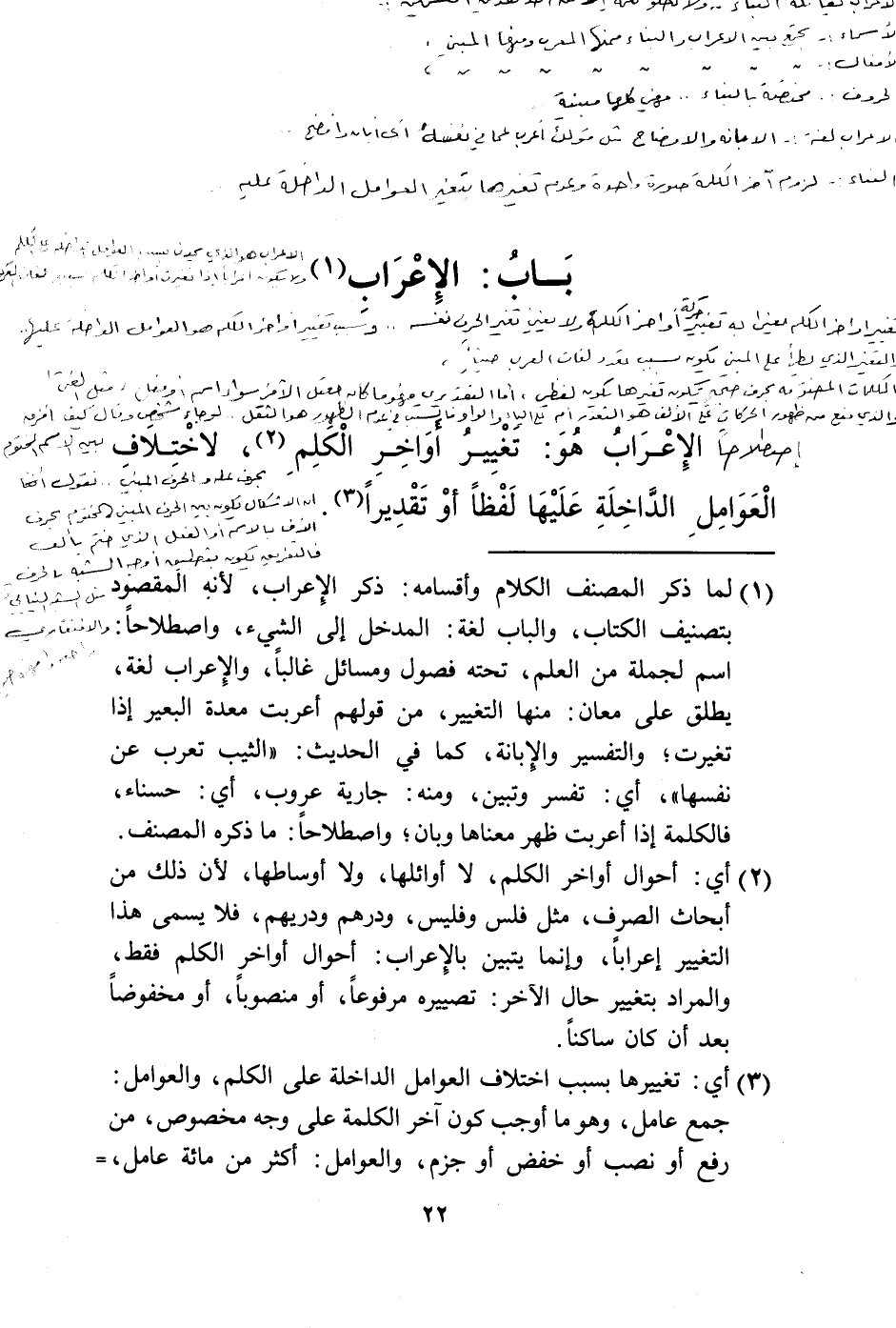 (1) لما ذكر المصنف الكلام وأقسامه: ذكر الإعراب لأنه المقصود بتصنيف الكتاب، والباب لغة: المدخل إلى الشيء، واصطلاحا: اسم لجملة من العلم، تحته فصول ومسائل غالبا، والإعراب لغة، يطلق على معان: منها التغيير، من قولهم أعربت معدة البعير إذا تغيرت؛ والتفسير والإبانة، كما في الحديث: «الثيب تعرب عن نفسها» أي: تفسر وتبين، ومنه: جارية عروب، أي: حسناء، فالكلمة إذا أعربت ظهر معناها وبان؛ واصطلاحا: ما ذكره المصنف.