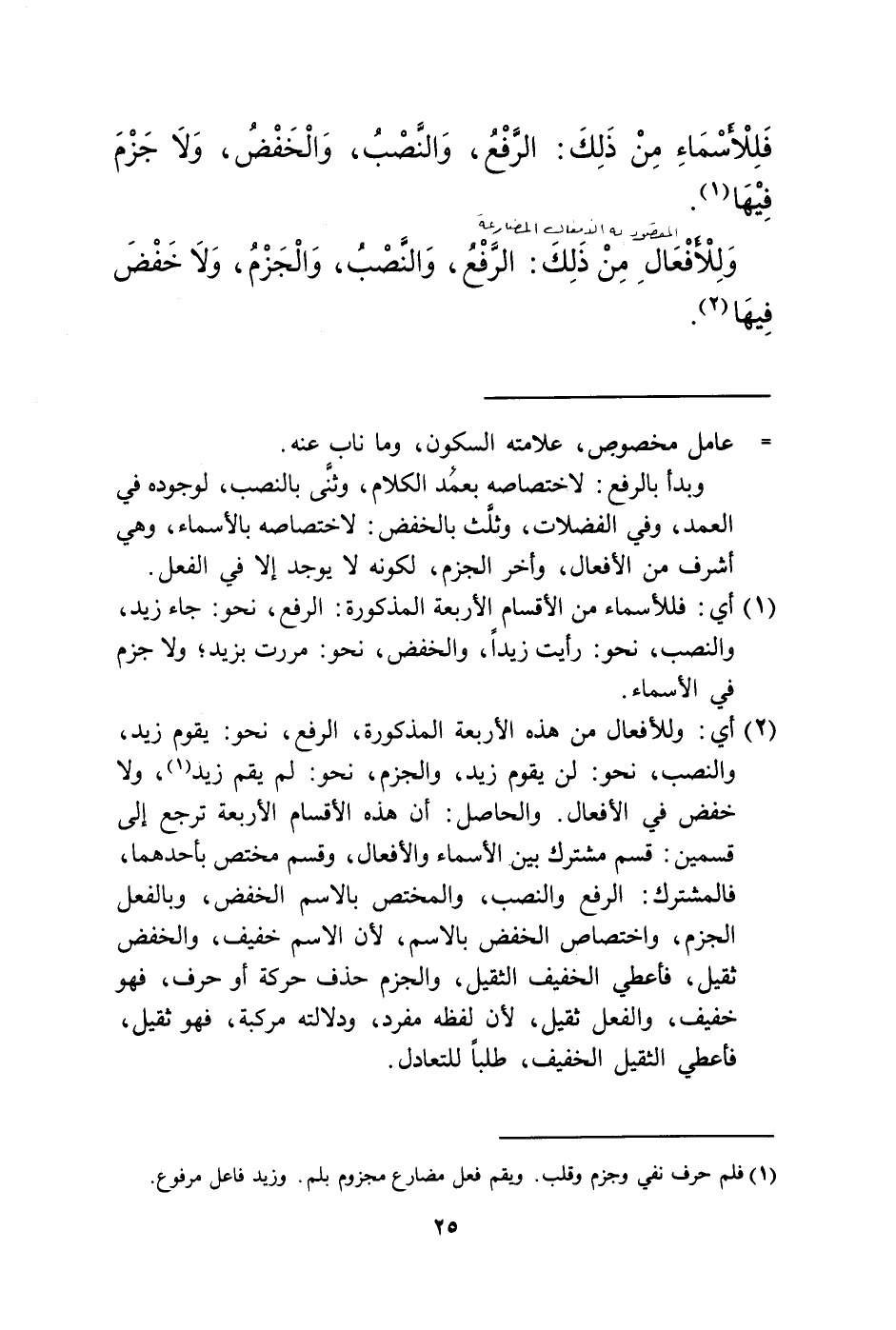 (1) أي: فللأسماء من الأقسام الأربعة المذكورة: الرفع، نحو: جاء زيد، والنصب، نحو: رأيت زيدا، والخفض، نحو: مررت بزيد، ولا جزم في الأسماء.