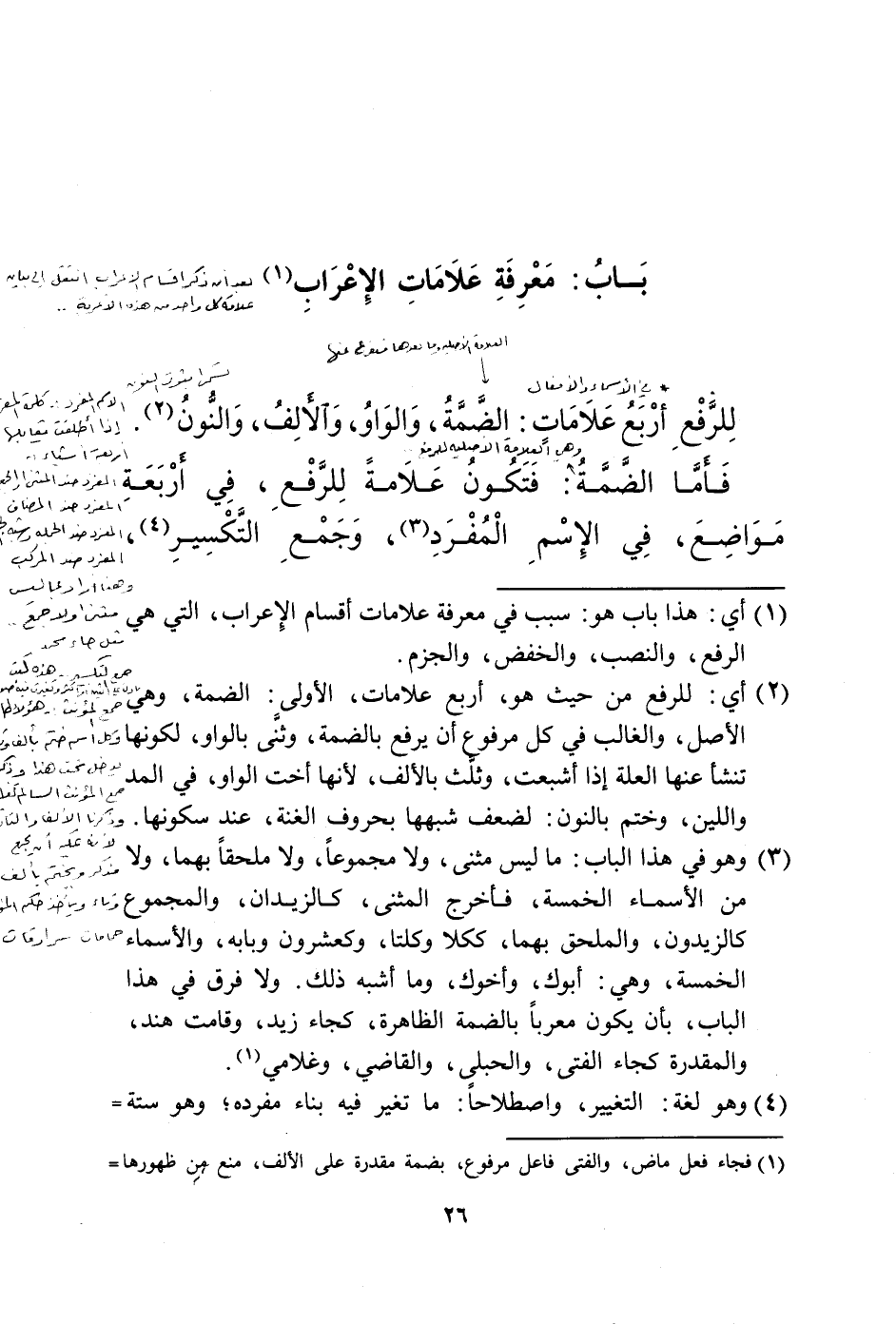 (2) أي: للرفع من حيث هو، أربع علامات، الأولى: الضمة، وهي الأصل، والغالب في كل مرفوع أن يرفع بالضمة، وثنى بالواو، لكونها تنشأ عنها العلة إذا أشبعت، وثلث بالألف، لأنها أخت الواو، في المد واللين، وختم بالنون: لضعف شبهها بحروف الغنة، عند سكونها.