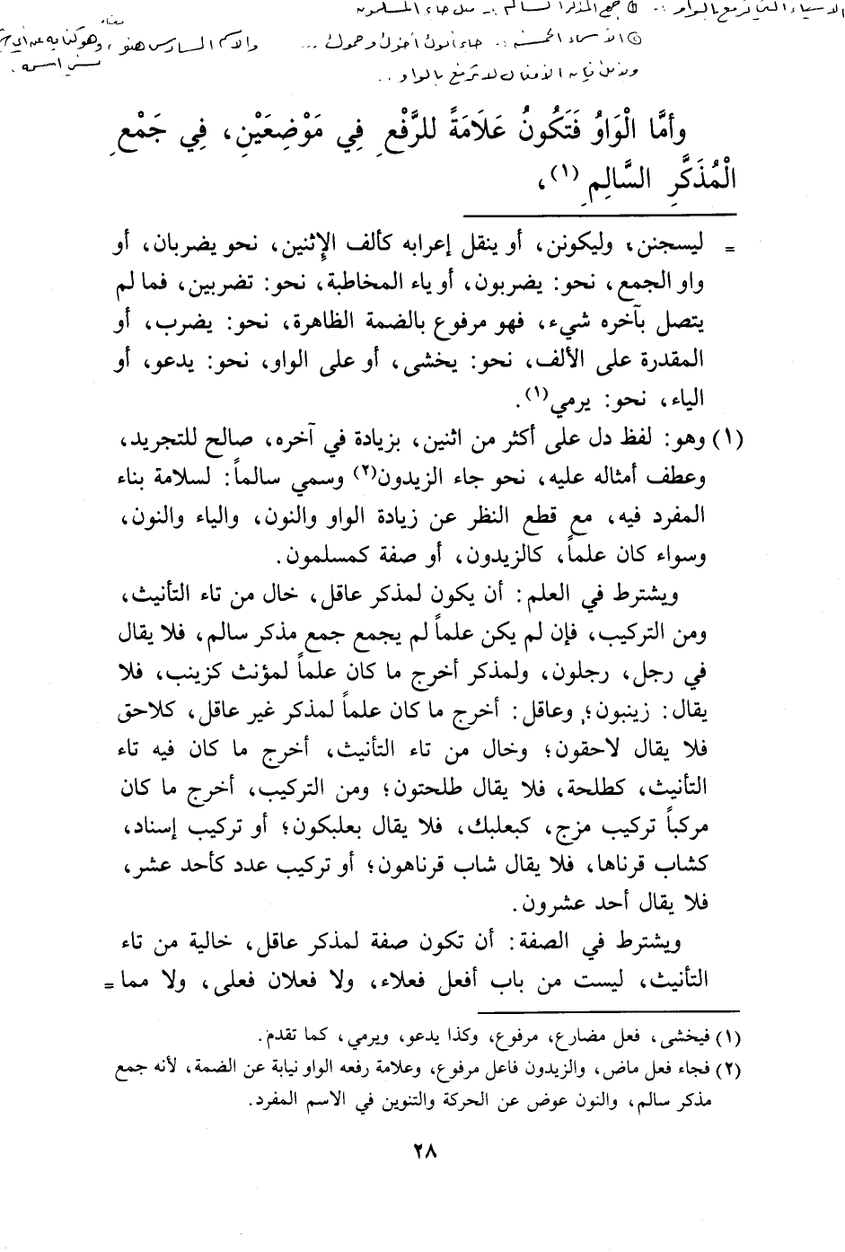 (1) وهو: لفظ دل على أكثر من اثنين، بزيادة في آخره، صالح للتجريد، وعطف أمثاله عليه، نحو جاء الزيدون (2) وسمي سالما: لسلامة بناء المفرد فيه، مع قطع النظر عن زيادة الواو والنون، والياء والنون، وسواء كان علما، كالزيدون، أو صفة كمسلمون.