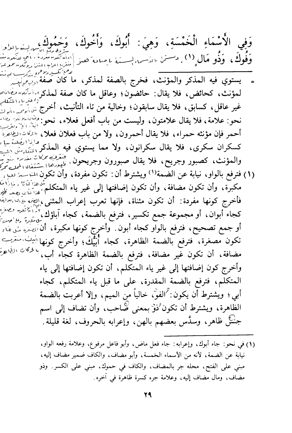 (1) فترفع بالواو، نيابة عن الضمة (1) ويشترط أن: تكون مفردة، وأن تكون مكبرة، وأن تكون مضافة، وأن تكون إضافتها إلى غير ياء المتكلم، فأخرج كونها مفردة: أن تكون مثناة، فإنها تعرب إعراب المثنى، كجاء أبوان، أو مجموعة جمع تكسير، فترفع بالضمة، كجاء آباؤك، أو جمع تصحيح، فترفع بالواو كجاء أبون. وأخرج كونها مكبرة أن تكون مصغرة، فترفع بالضمة الظاهرة، كجاء أبيك، وأخرج كونها مضافة، أن تكون غير مضافة، فترفع بالضمة الظاهرة كجاء أب، وأخرج كون إضافتها إلى غير ياء المتكلم، أن تكون إضافتها إلى ياء المتكلم، فترفع بالضمة المقدرة على ما قبل ياء المتكلم، كجاء أبي؛ ويشترط أن يكون: الفو، خاليا من الميم، وإلا أعربت بالضمة الظاهرة، ويشترط أن تكون ذو بمعنى صاحب، وأن تضاف إلى اسم جنس ظاهر، وسدس بعضهم بالهن، وإعرابه بالحروف، لغة قليلة.