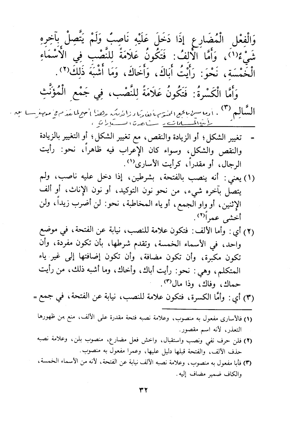 وَالْفِعْلِ الْمُضَارِعِ إِذَا دَخَلَ عِلَيْهِ نَاصِبٌ، وَلَمْ يَتَّصِلُ بِآخِرِهِ شَيْءٌ (1) ، وَأَمَّا الألِفُ فَتَكُونُ عَلاَمَةً لِلنَّصْبِ في الأسْمَاءِ الْخَمْسَةِ، نَحُوَ " رَأَيْتُ أَبَاكَ وَأَخَاكَ " وَمَا أَشْبَهَ ذلِكَ (2) .