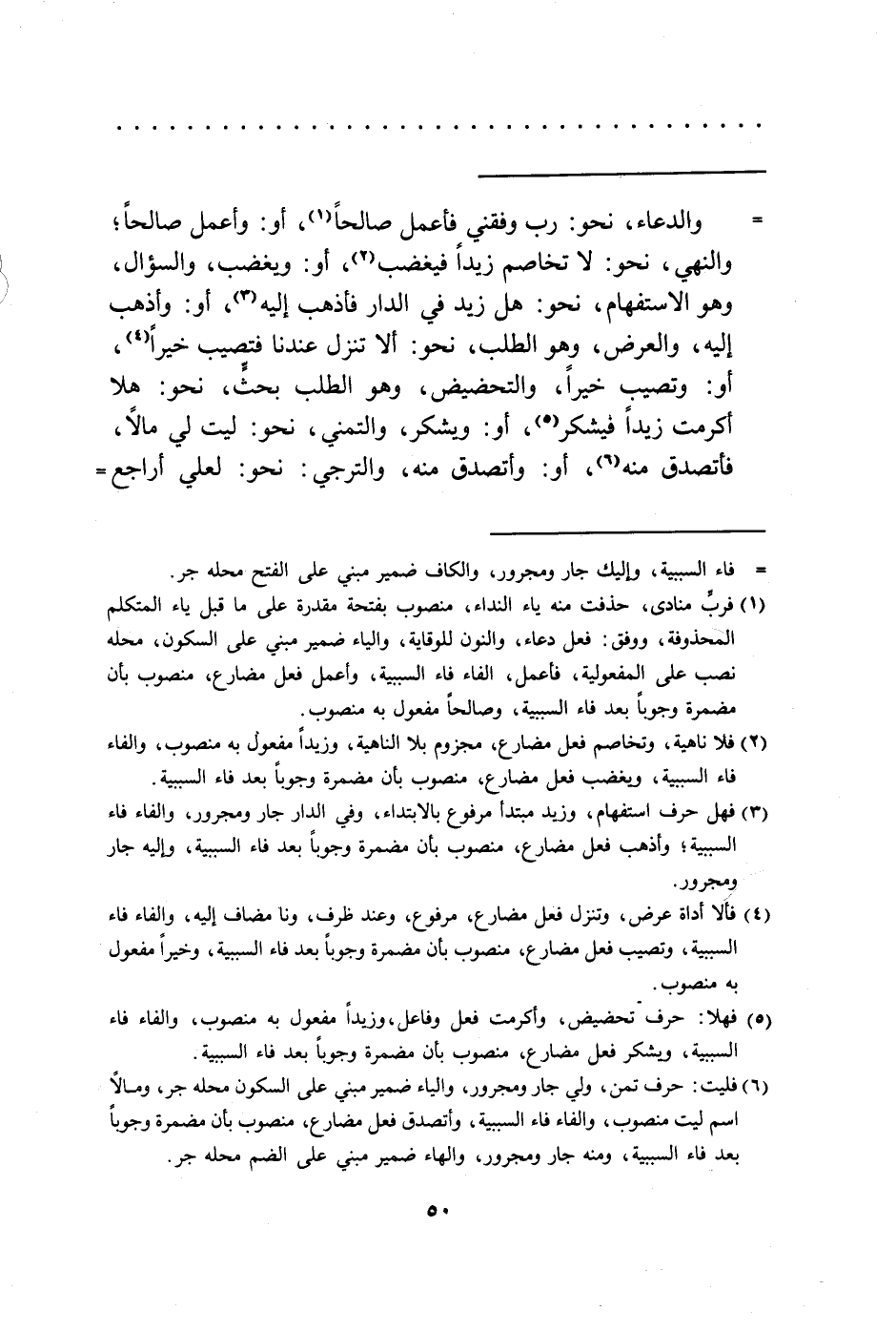 الدعاء نحو: رب وفقني فأعمل صالحا (1) ، أو: أعمل صالحا، والنهي نحو: لا تخاصم زيدا فيغضب (2) ، أو: ويغضب، والسؤال، وهو الاستفهام، نحو: هل زيد في الدار فأذهب إليه (3) ، أو: وأذهب إليه، والعرض، وهو الطلب نحو: ألا تنزل عندنا فتصيب خيرا (4) ، أو: وتصيب خيرا، والتخضيض، وهو الطلب بحث نحو: هلا أكرمت زيدا فيشكر (5) ، أو: ويشكر، والتمني، نحو: ليت لي مالا، فأتصدق منه (6) ،
