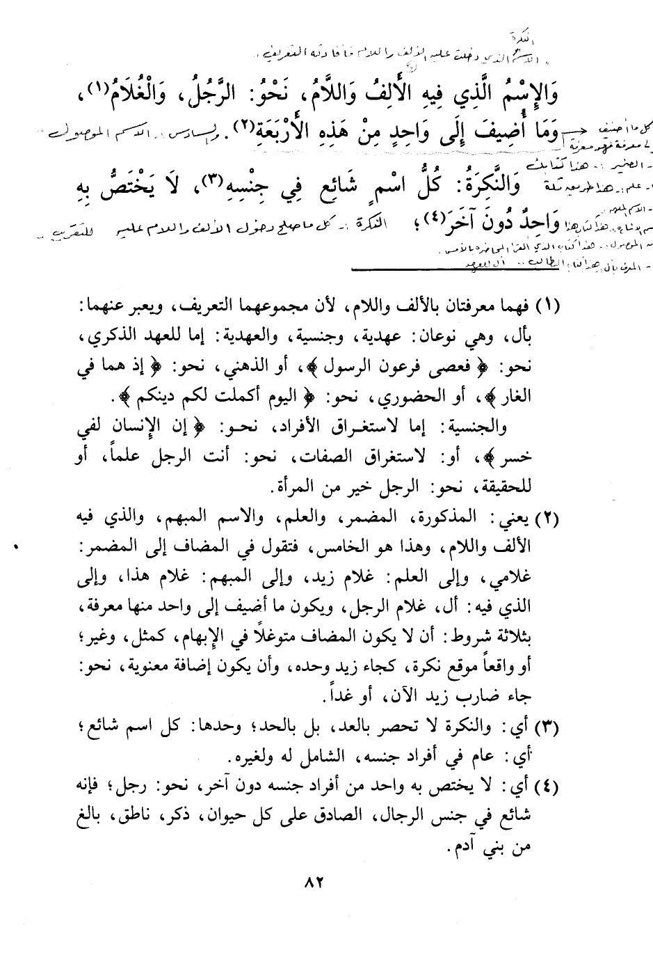 (4) الاسم المبهم: يشمل اسم الإشارة كما مثل والموصول، واسم الإشارة أقسام فنحو: هذا، لحيوان وجماد، ورجل: لمفرد المذكر، وهذه: للمفردة المؤنثة، وهذان: لمثنى المذكر، وهاتان: لمثنى المؤنث، وهؤلاء: لجمع المذكر، والمؤنث، ومراتب المشار إليه: ثلاث هذا للقريب، وذاك للمتوسط، وذلك للبعيد.