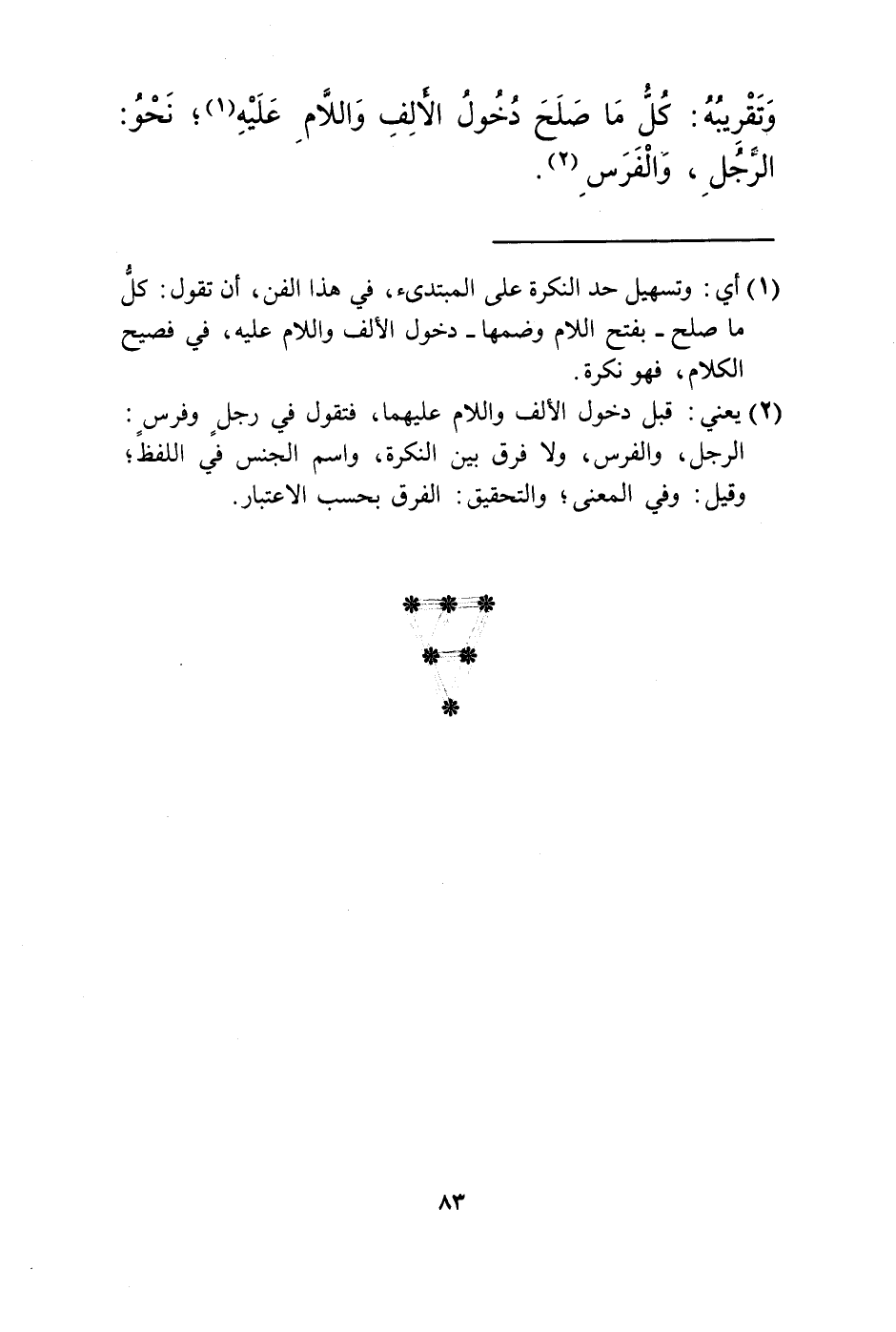 (3) أي: والنكرة لا تحصر بالعد، بل بالحد، وحدها: كل اسم شائع، أي: عام في أفراد جنسه، الشامل له ولغيره.