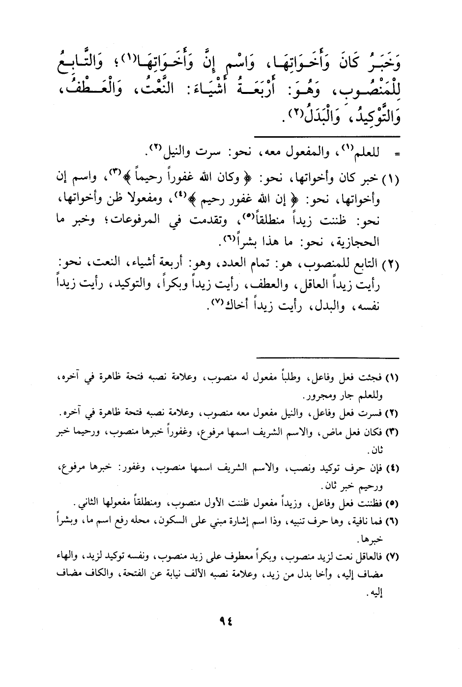 والمصدرُ (1) ، وظرفُ الزمانِ، وظرفُ المكانِ (2) ، والحال، والتمييزُ (3) ، والمُستثنى، واسم لا، والمُنادى (4) ، والمفعول من أجله، والمفعولُ معهُ (5) ،
