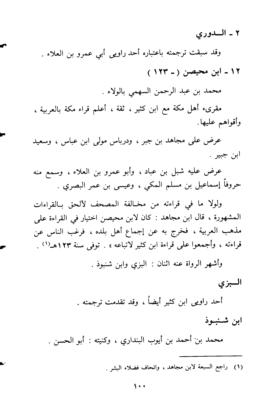 ولولا ما في قراءته من مخالفة المصحف لألحق بالقراءات المشهورة، قال ابن مجاهد: كان لابن محيصن اختيار في القراءة على مذهب العربية، فخرج به عن إجماع أهل بلده، فرغب الناس عن قراءته، وأجمعوا على قراءة ابن كثير لاتباعه". توفي سنة 123هـ1.