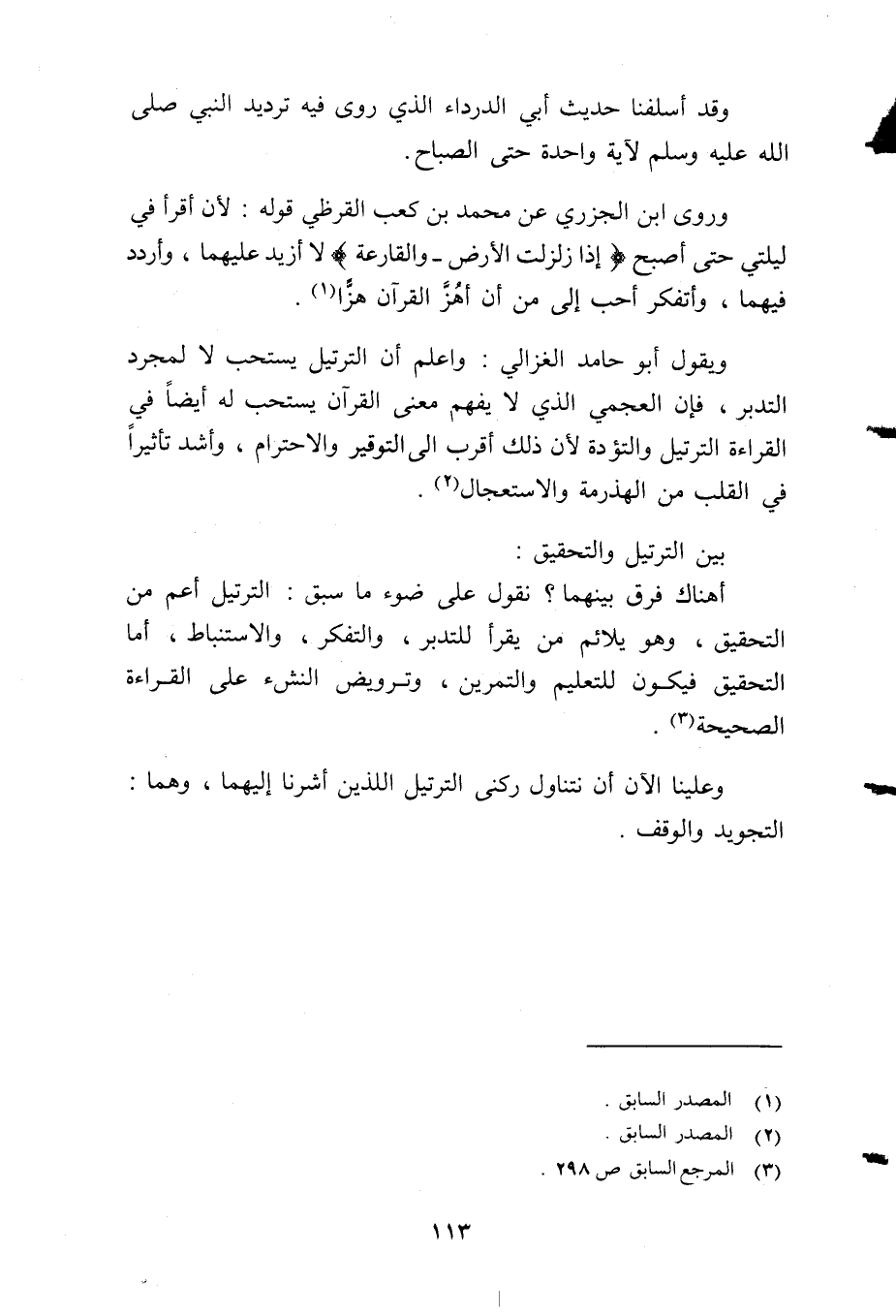 وعلينا الآن أن نتناول ركني الترتيل اللذين أشرنا إليهما، وهما: التجويد والوقف.