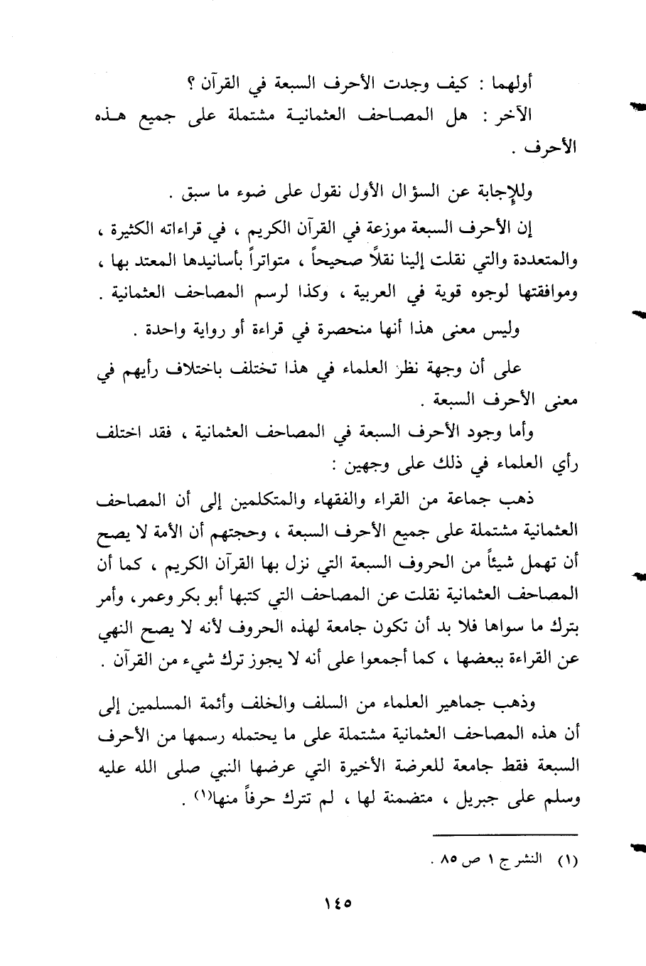 وأما وجود الأحرف السبعة في المصاحف العثمانية، فقد اختلف رأي العلماء في ذلك على وجهين: