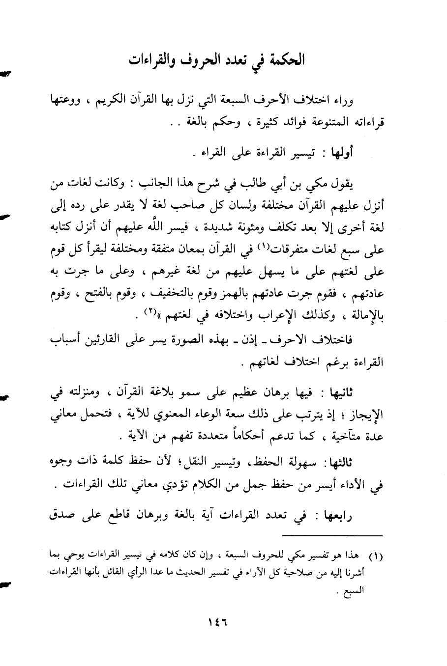 1 هذا هو تفسير مكي للحروف السبعة، وإن كان كلامه في تيسير القراءات يوحي بما أشرنا إليه من صلاحية كل الآراء في تفسير الحديث ما عدا الرأي القائل بأنها القراءات السبع.