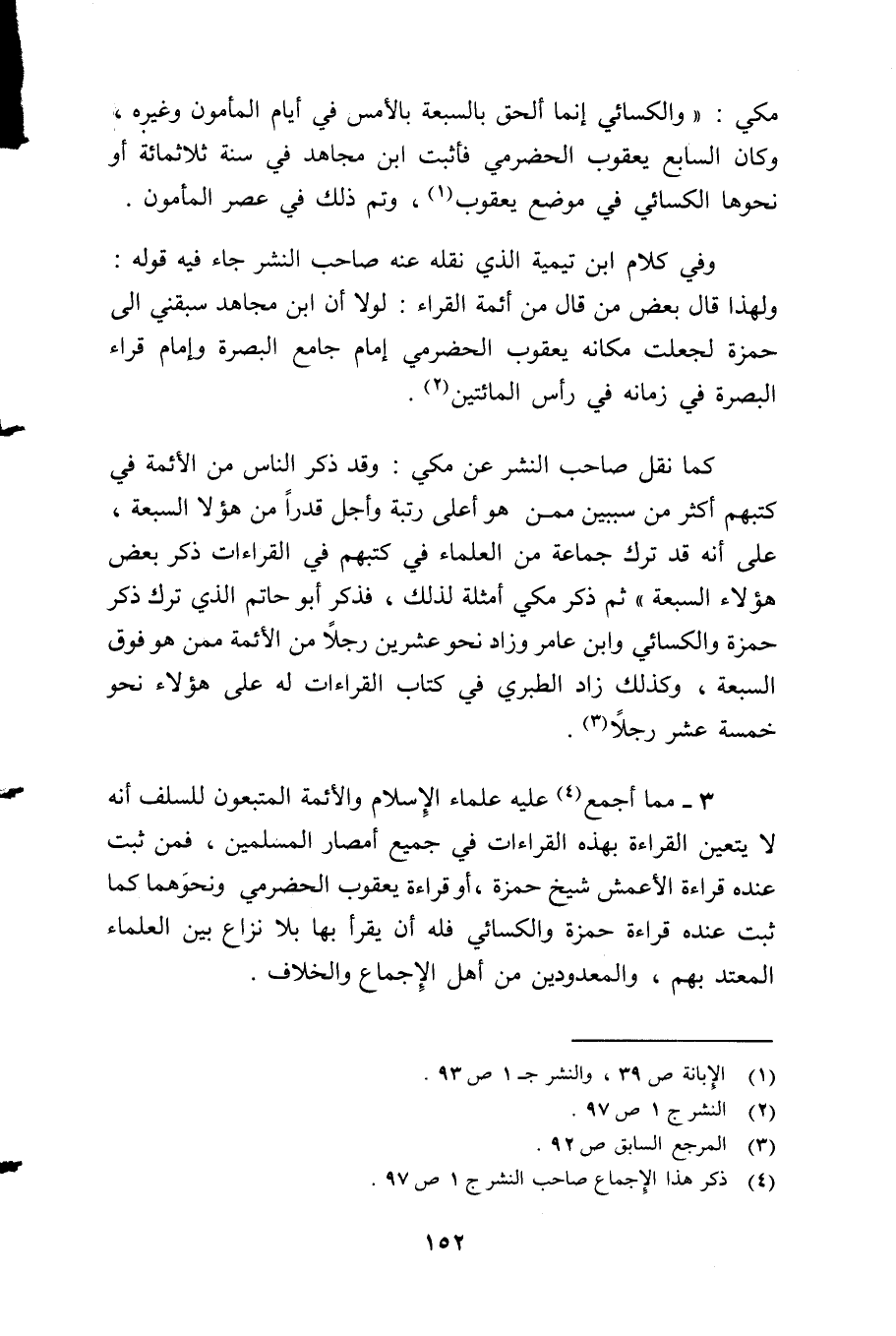 وفي كلام ابن تيمية الذي نقله عنه صاحب النشر جاء فيه قوله. ولهذا قال بعض من قال من أئمة القراء: لولا أن ابن مجاهد سبقني إلى حمزة لجعلت مكانه يعقوب الحضرمي إمام جامع البصرة وإمام قراء البصرة في زمانه في رأس المائتين2.