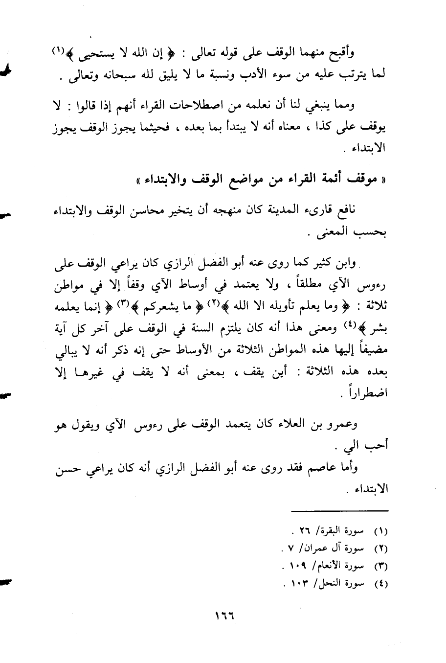 وابن كثير كما روى عنه أبو الفضل الرازي كان يراعي الوقف على رءوس الأي مطلقًا، ولا يعتمد في أوساط الآي وقفًا إلا في مواطن ثلاثة: {وَمَا يَعْلَمُ تَأْوِيلَهُ إِلَّا اللَّه} 2، {مَا يُشْعِرُكُم} 3، {إِنَّمَا يُعَلِّمُهُ بَشَر} 4، ومعنى هذا أنه كان يلتزم السنة في الوقف على آخر كل آية مضيفًا إليها هذه المواطن الثلاثة من الأوساط حتى إنه ذكر أنه لا يبالي بعده هذه الثلاثة: أين يقف، بمعنى أنه لا يقف في غيرها إلا اضطرارًا.