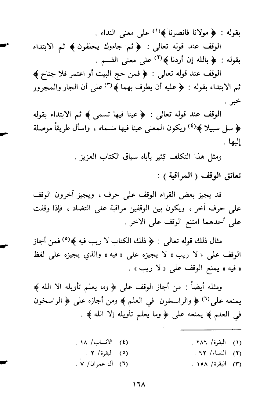 ومثله أيضًا: من أجاز الوقف على {وَمَا يَعْلَمُ تَأْوِيلَهُ إِلَّا اللَّه} يمنعه على6، {وَالرَّاسِخُونَ فِي الْعِلْم} ومن أجازه على {الرَّاسِخُونَ فِي الْعِلْم} يمنعه على {وَمَا يَعْلَمُ تَأْوِيلَهُ إِلَّا اللَّه} .
