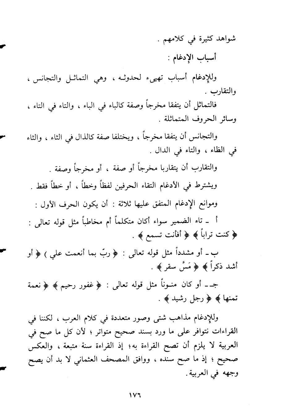 وللإدغام مذاهب شتى وصور متعددة في كلام العرب، لكننا في القراءات نتوافر ما ورد بسند صحيح متواتر؛ لأن كل ما صح في العربية لا يلزم أن تصح القراءة به؛ إذ القراءة سنة متبعة، والعكس صحيح؛ إذ ما صح سنده، ووافق المصحف العثماني لا بد أن يصح وجهه في العربية.