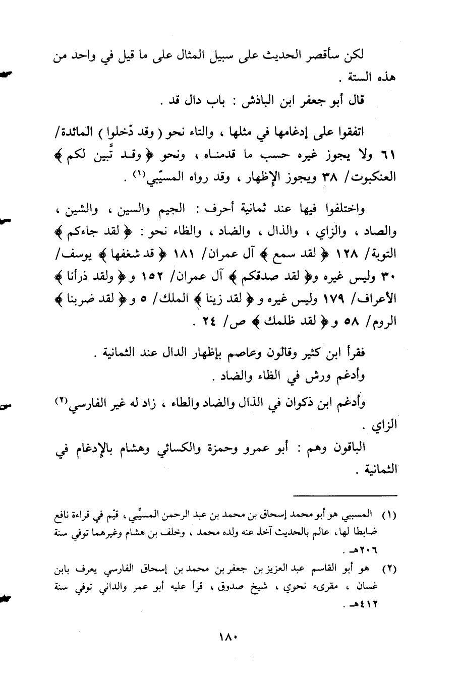 1 المسيّبي هو أبو محمد إسحاق بن محمد بن عبد الرحمن المسيبي، قيم في قراءة نافع ضابطًا لها، عالم بالحديث آخذ عنه ولده محمد، وخلف بن هشام وغيرهما توفي سنة 206هـ.