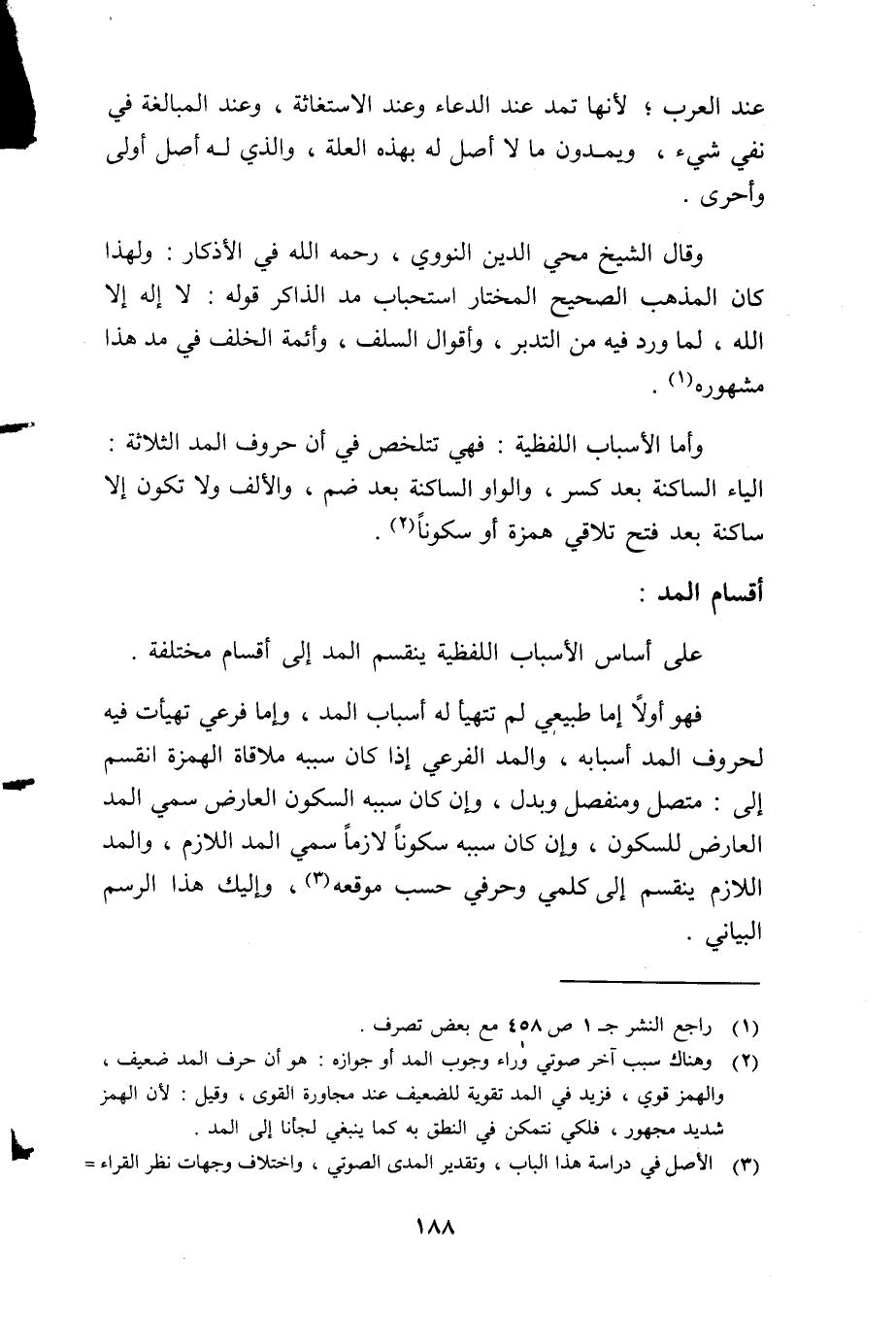 3 الأصل في دراسة هذا الباب، وتقدير المدى الصوتي، واختلاف وجهات نظر القراء في تحقيقه يرجع إلى ما رواه الطبراني عن ابن مسعود -رضي الله عنه- ولفظه: كان ابن مسعود يقرئ رجلًا، فقرأ الرجل: {إِنَّمَا الصَّدَقَاتِ لِلْفُقَرَاءِ وَالْمَسَاكِين} مرسلة، أي مقصورة، فقال ابن مسعود: ما هكذا أقرأنيها رسول الله -صلى الله عليه وسلم- فقال: وكيف أقرأكها يا أبا عبد الرحمن؟ فقال: أقرأنيها: {إِنَّمَا الصَّدَقَاتِ لِلْفُقَرَاءِ وَالْمَسَاكِين} ، فمدها.