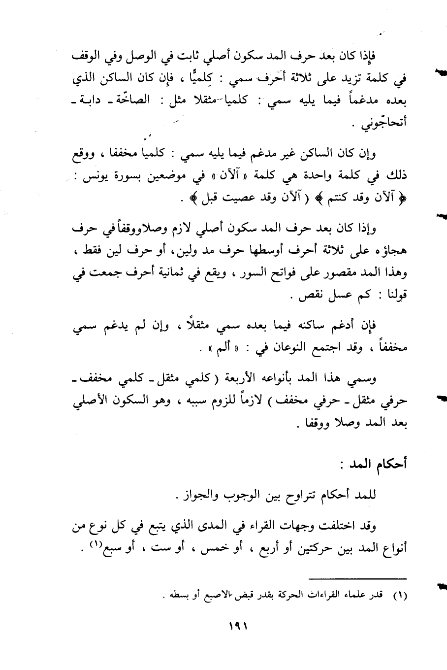 وقد اختلفت وجهات القراء في المدى الذي يتبع في كل نوع من أنواع المد بين حركتين أو أربع، أو خمس، أو ست، أو سبع1.