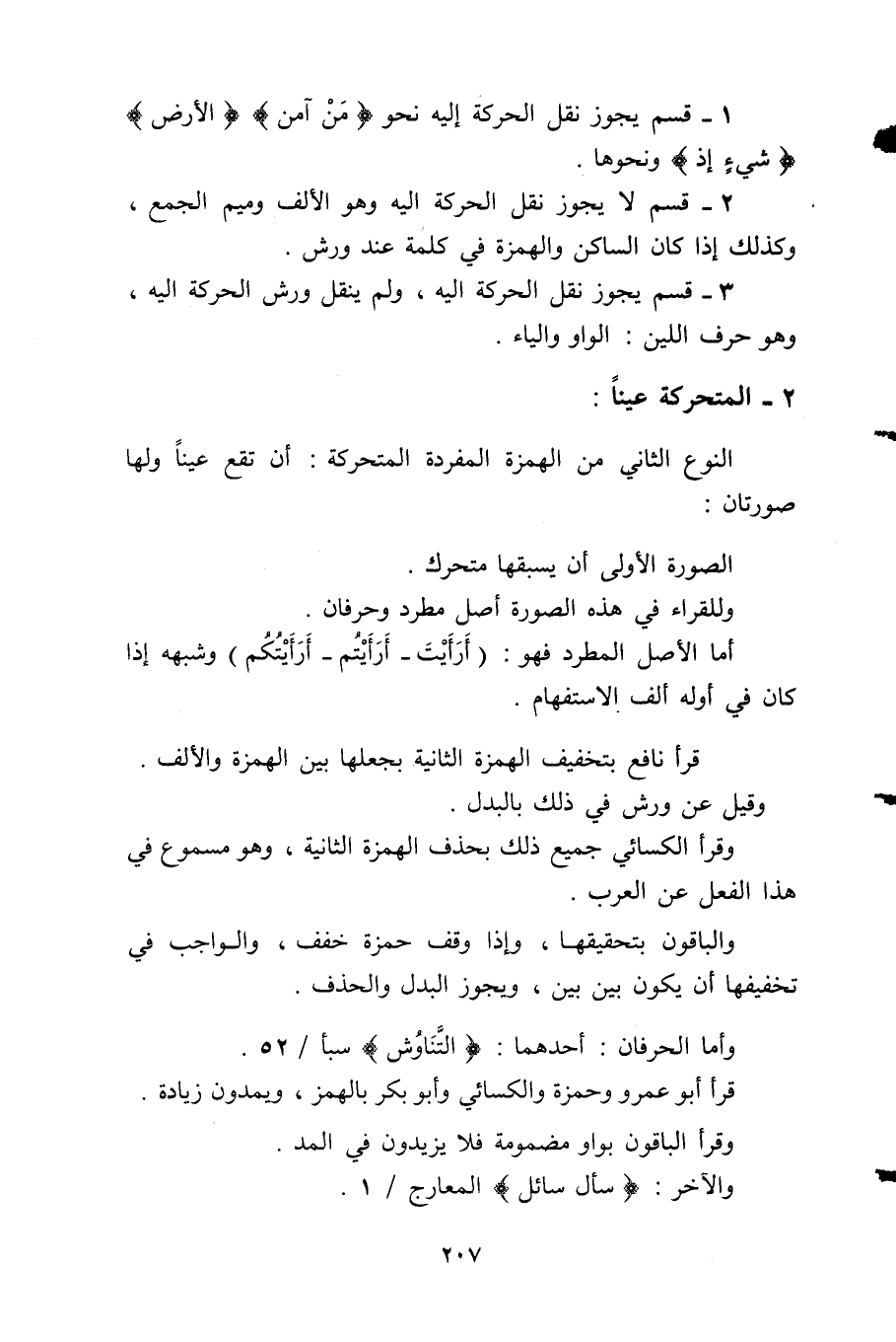 2- قسم لا يجوز نقل الحركة إليه وهو الألف وميم الجمع، وكذلك إذا كان الساكن والهمزة في كلمة عند ورش.