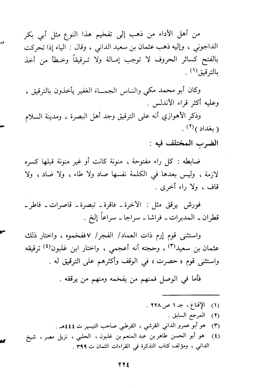 واستثنى قوم: {إِرَمَ ذَاتِ الْعِمَادِ} [الفجر: 7] ففخموه، واختار ذلك عثمان بن سعيد3، وحجته أنه أعجمي، واختار ابن غلبون4، ترقيقه واستثنى قوم: "حصرت" في الوقف وأكثرهم على الترقيق له.