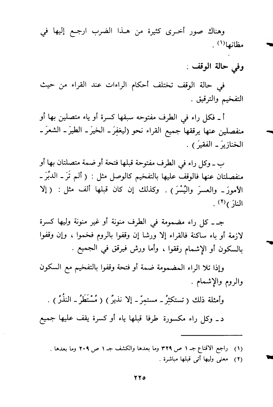 ب- وكل راء في الطرف مفتوحة قبلها فتحة أو ضمة متصلتان بها أو منفصلتان عنها، فالوقف عليها بالتفخيم كالوصل مثل: "ألم تَرَ، الدبُرَ، الأمورَ، والعسرَ، واليسرَ". وكذلك إن كان قبلها ألف مثل: "إلا النار"2.