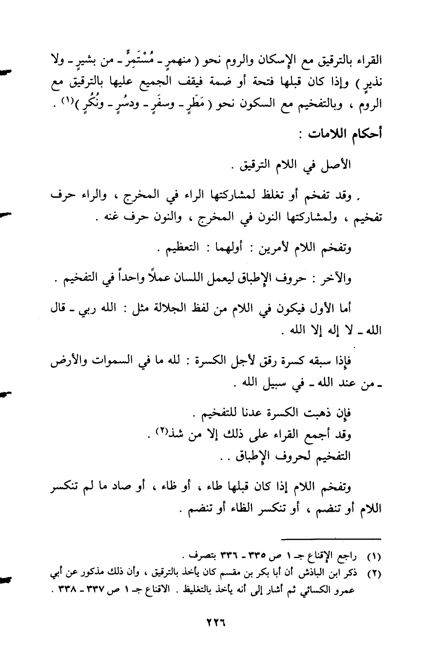 2 ذكر ابن الباذش أن أبا بكر بن مقسم كان يأخذ بالترقيق، وأن ذلك مذكور عن أبي عمرو الكسائي ثم أشار إلى أنه يأخذ بالتغليظ. الإقناع ج1 ص337- 338.
