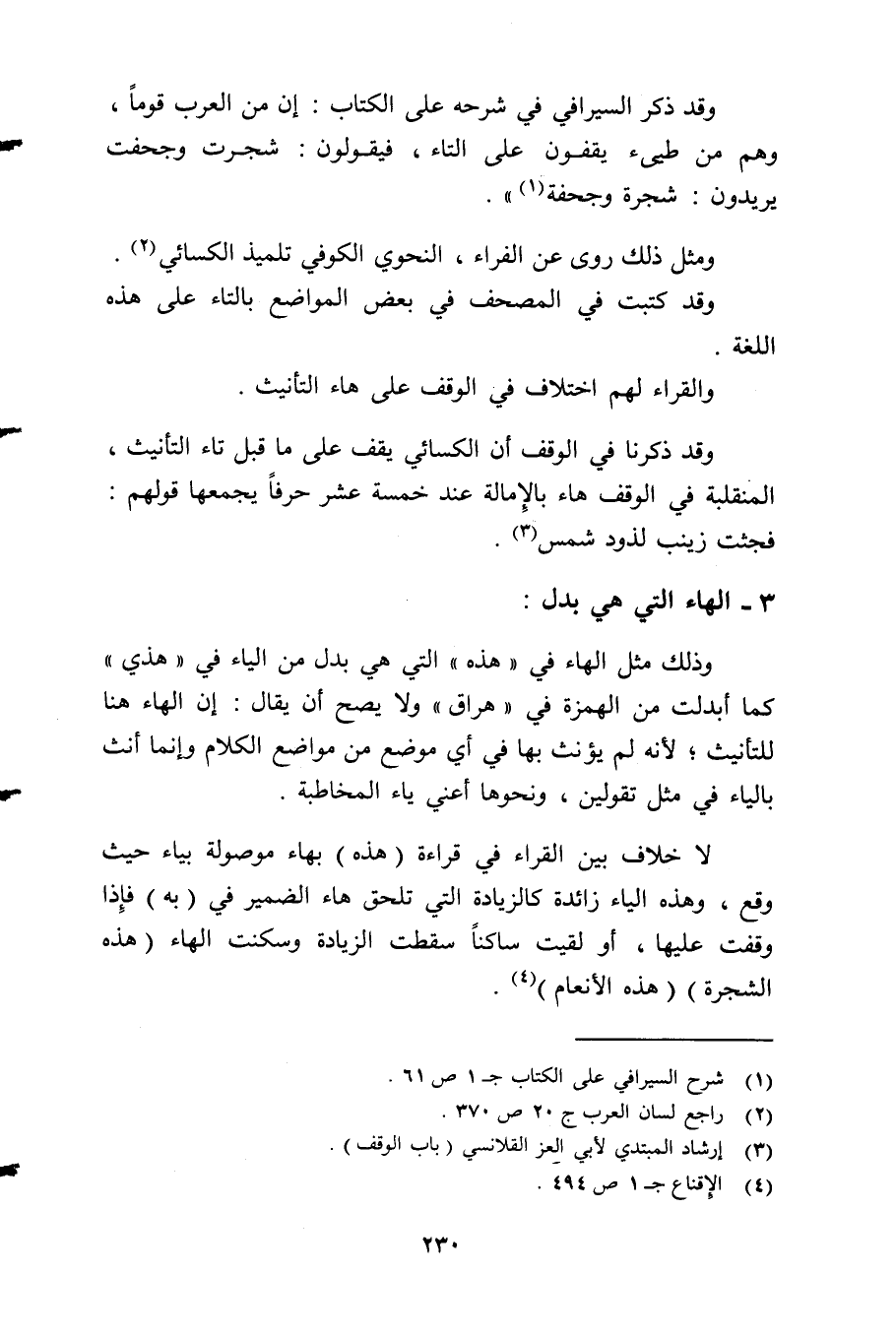 وقد ذكر السيرافي في شرحه على الكتاب: إن من العرب قومًا، وهو من طيئ يقفون على التاء، فيقولون: شجرت وجحفت يريدون:شجرة وجحفة1.