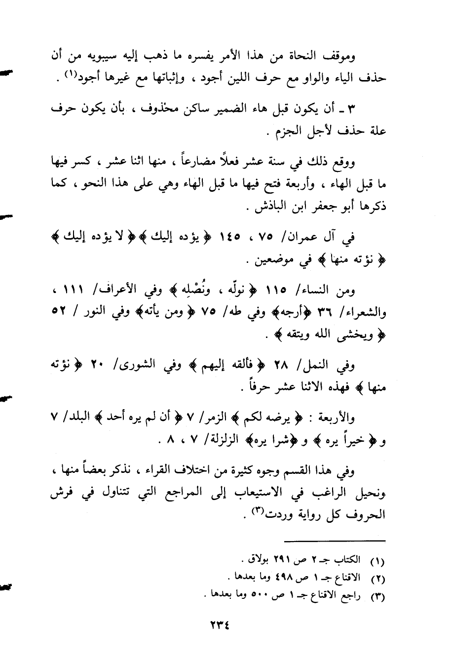 وفي هذا القسم وجوه كثيرة من اختلاف القراء، نذكر بعضًا منها، ونحيل الراغب في الاستيعاب إلى المراجع التي تتناول في فرش الحروف كل رواية وردت3.