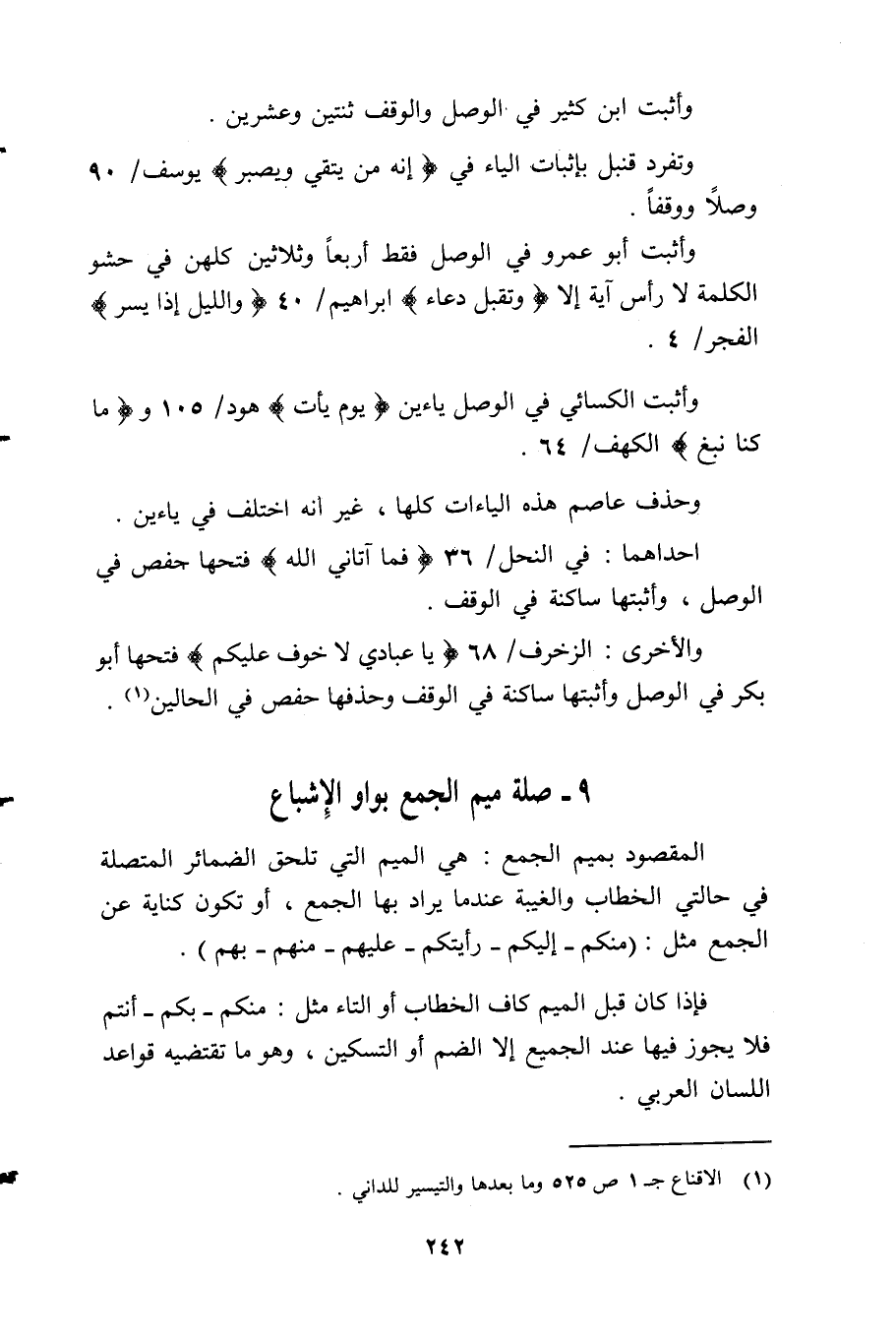 وأثبت أبو عمرو في الوصل فقط أربعًا وثلاثين كلهن في حشو الكلمة لا رأس آية إلا: {وَتَقَبَّلْ دُعَاء} [إبراهيم: 40] {وَاللَّيْلِ إِذَا يَسْر} [الفجر: 4] .