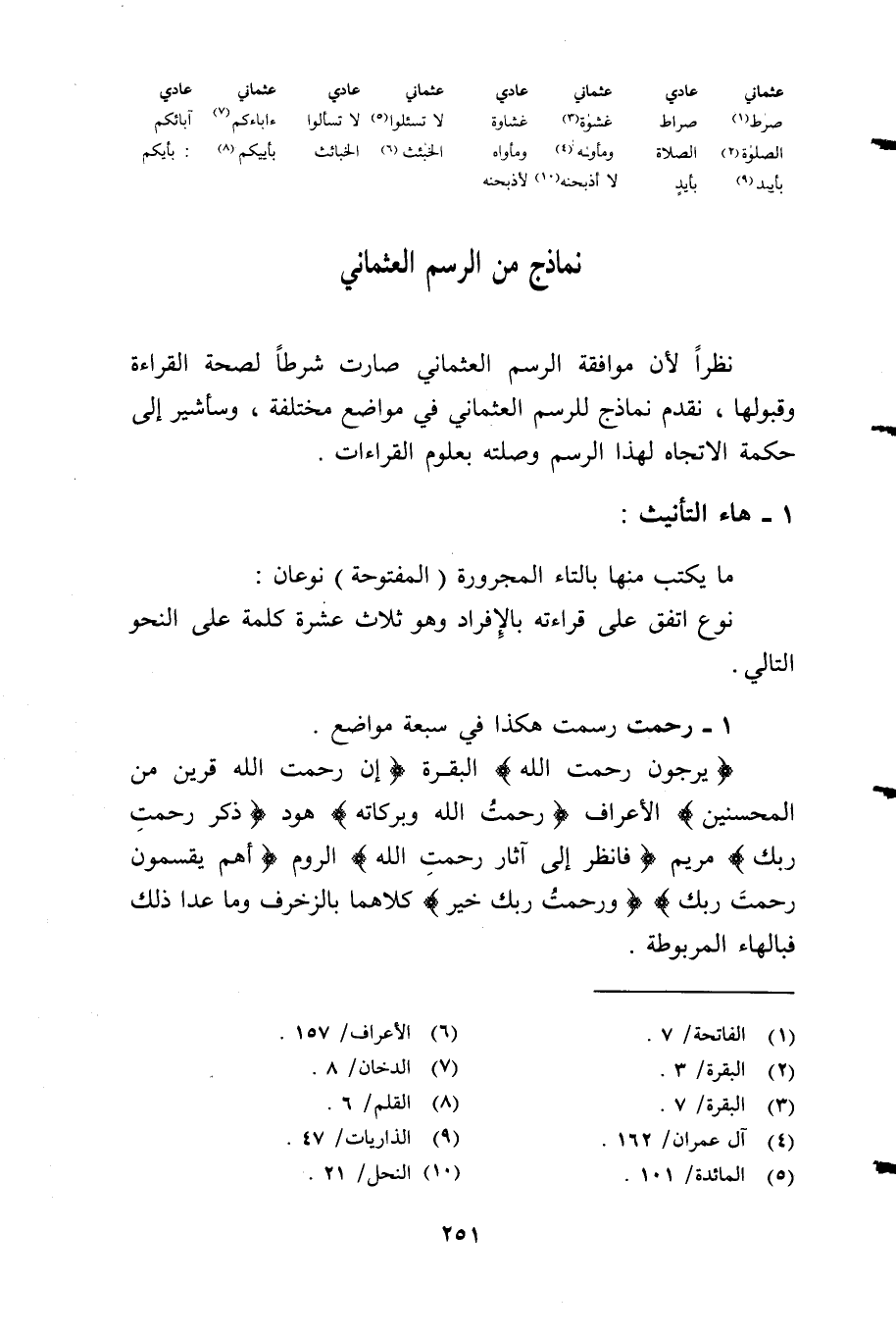 نظرًا لأن موافقة الرسم العثماني صارت شرطًا لصحة القراءة وقبولها، نقدم نماذج للرسم العثماني في مواضع مختلفة، وسأشير إلى حكمة الاتجاه لهذا الرسم وصلته بعلوم القراءات.