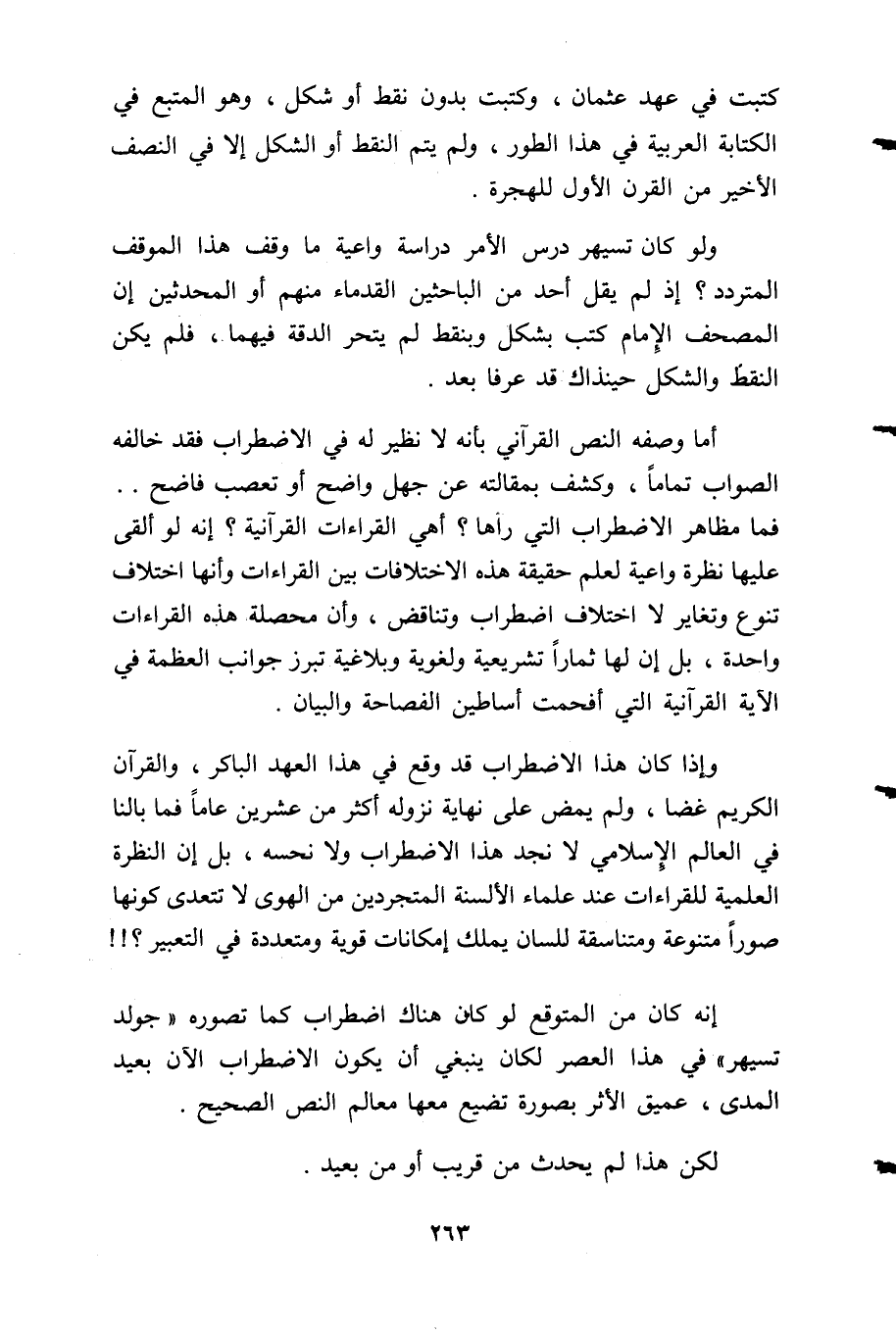 ولو كان تسيهر درس الأمر دراسة واعية ما وقف هذا الموقف المتردد؟ إذ لم يقل أحد من الباحثين القدماء منهم أو المحدثين إن المصحف الإمام كتب بشكل وبنقط لم يتحرَ الدقة فيهما، فلم يكن النقط والشكل حينذاك قد عرفا بعد.