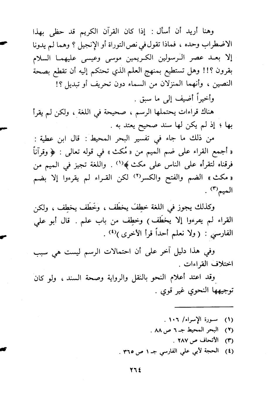وهنا أريد أن أسأل: إذا كان القرآن الكريم قد حظي بهذا الاضطراب وحده، فماذا تقول في نص التوراة أو الإنجيل؟ وهما لم يدونا إلا بعد عصر الرسولين الكريمين موسى وعيسى عليهما السلام بقرون؟!! وهل تستطيع بمنهج العلم الذي تحتكم إليه أن تقطع بصحة النصين، وأنهما المنزلان من السماء دون تحريف أو تبديل؟!