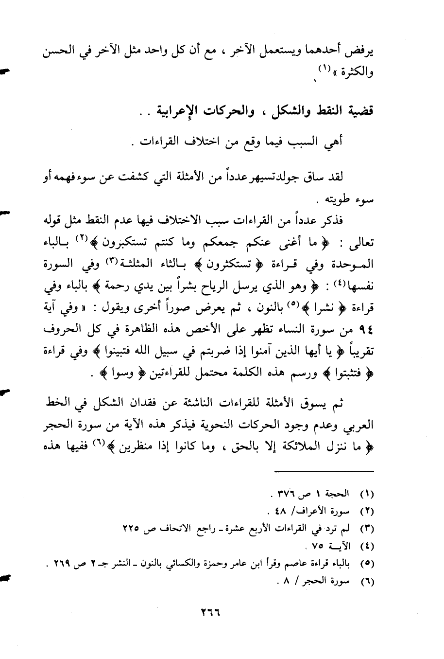 ثم يسوق الأمثلة للقراءات الناشئة عن فقدان الشكل في الخط العربي وعدم وجود الحركات النحوية فيذكر هذه الآية من سورة الحجر: {مَا نُنَزِّلُ الْمَلَائِكَةَ إِلَّا بِالْحَقِّ وَمَا كَانُوا إِذًا مُنْظَرِينَ} 6، ففيها هذه