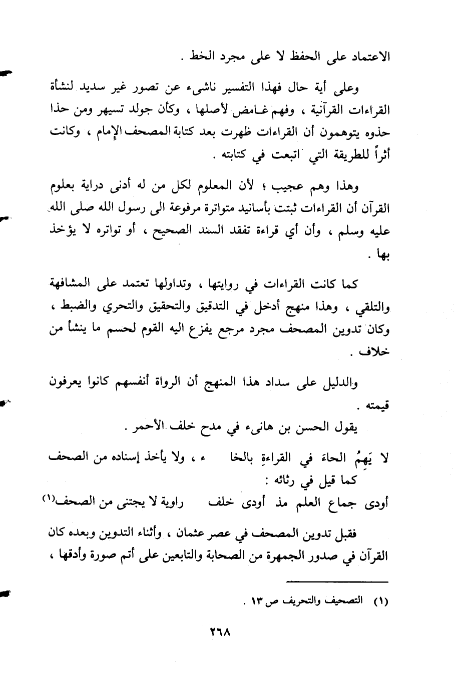 وعلى أية حال فهذا التفسير ناشئ عن تصور غير سديد لنشأة القراءات القرآنية، وفهم غامض لأصلها، وكأن جولد تسيهر ومن حذا حذوه يتوهمون أن القراءات ظهرت بعد كتابة المصحف الإمام، وكانت أثرًا للطريقة التي اتبعت في كتابته.