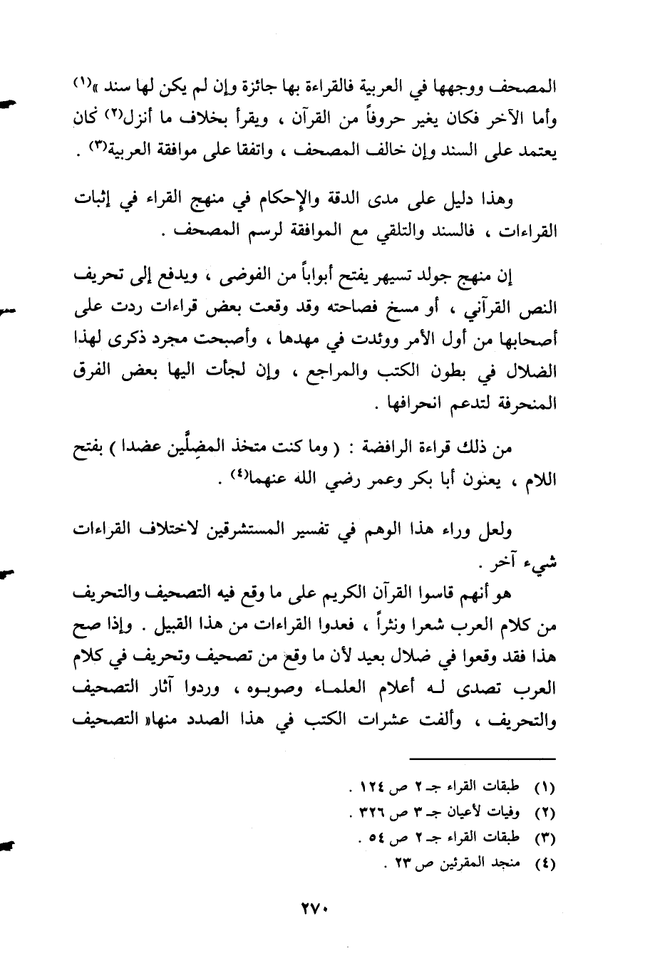 إن منهج جولد تسيهر يفتح أبوابًا من الفوضى، ويدفع إلى تحريف النص القرآني، أو مسخ فصاحته وقد وقعت بعض قراءات ردت على أصحابها من أول الأمر ووثدت في مهدها، وأصبحت مجرد ذكرى لهذا الضلال في بطون الكتب والمراجع، وإن لجأت إليها بعض الفرق المنحرفة لتدعم انحرافها.