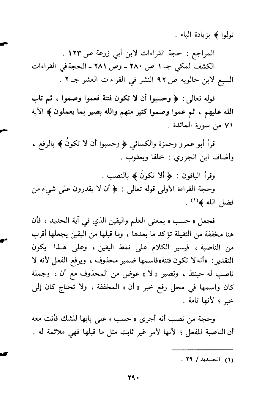 فجعل "حسب" بمعنى العلم واليقين الذي في آية الحديد، فإن هنا مخففة من الثقيلة تؤكد ما بعدها، وما قبلها من اليقين يجعلها أقرب من الناصبة، فيسير الكلام على نمط اليقين، وعلى هذا يكون التقدير: "أنه لا تكون فتنة" فاسمها ضمير محذوف، ويرفع الفعل؛ لأنه لا ناصب له حينئذ، وتصير "لا" عوض من المحذوف مع أن، وجملة كان واسمها في محل رفع خبر "أن" المخففة، ولا تحتاج كان إلى خبر؛ لأنها تامة.