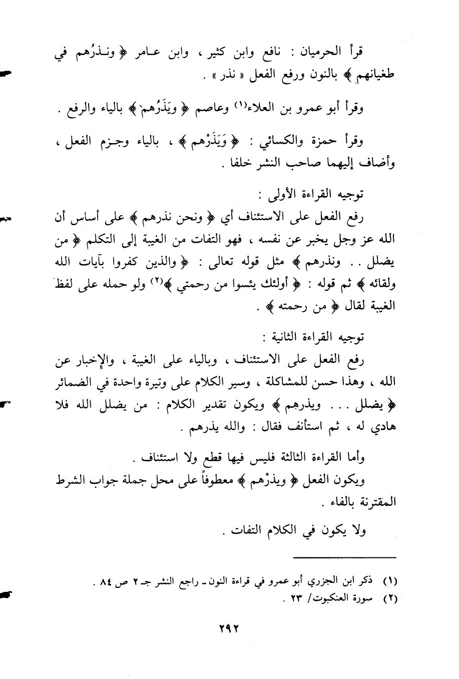 قرأ الحرميان: نافع وابن كثير، وابن عامر: "وَنذَرُهُمْ فِي طُغْيَانِهِمْ"، بالنون ورفع الفعل "نذر".