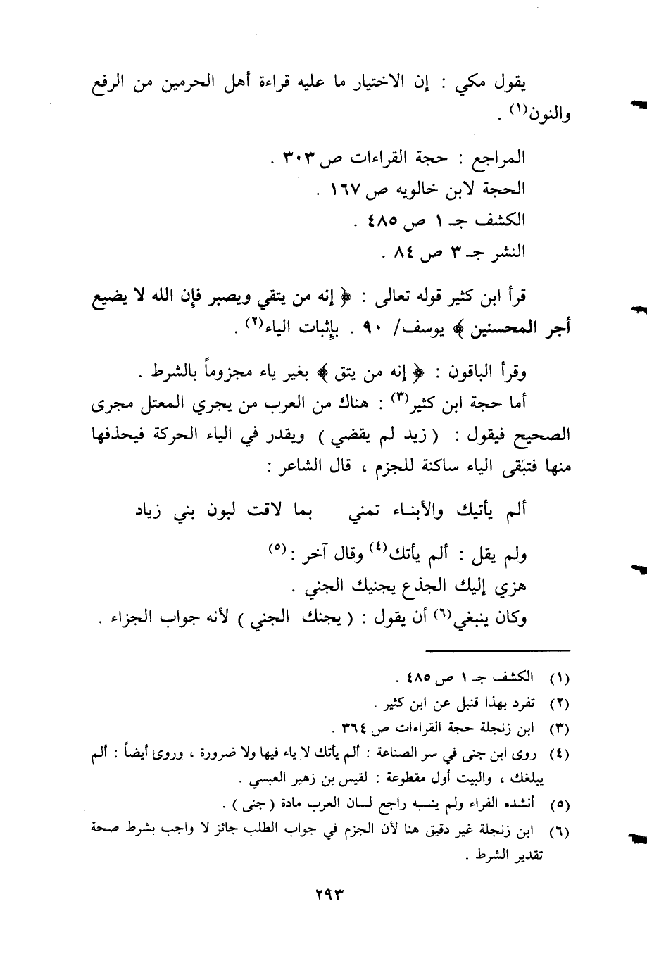 أما حجة ابن كثير3: هناك من العرب من يجري المعتل مجرى الصحيح فيقول: "زيد لم يقضي" ويقدر في الياء الحركة فيحذفها منها فتبقى الياء ساكنة للجزم، قال الشاعر: